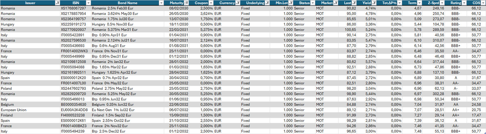 Il segmento medio-lungo (2027–2045) mantiene una configurazione positiva, con un’inclinazione regolare e rendimenti massimi concentrati tra le scadenze 2042 e 2045, attualmente in aumento e attorno al 2,80%. La curva in questa fascia riflette un equilibrio stabile tra attese di crescita, premio al rischio e ritorno alla normalità delle condizioni di mercato.