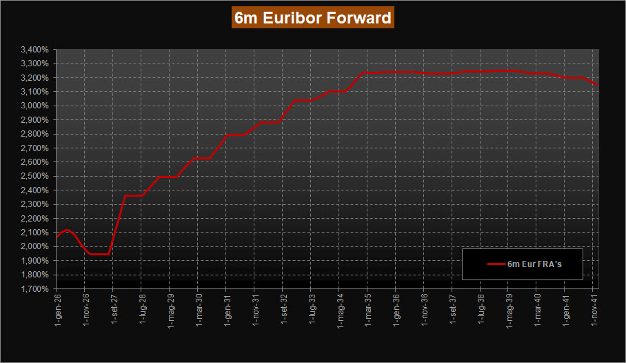 In parallelo, il forward a 6 mesi sull’Euribor si colloca poco sotto la soglia dell’1,95%, mantenendosi in un’area coerente con le aspettative di tassi stabili da parte della BCE nel medio periodo.