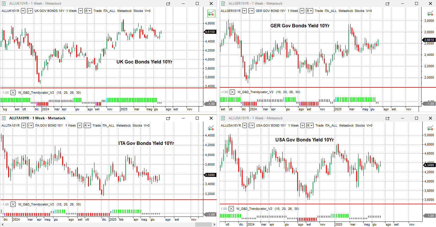 Nel Regno Unito, il rendimento del Gilt decennale risale al 4,61%, annullando del tutto la flessione osservata a giugno. Il Trendycator resta su NEUTRAL, coerente con un mercato ancora privo di struttura direzionale, complice una Bank of England ancora ancorata a un difficile equilibrio tra inflazione e stagnazione.