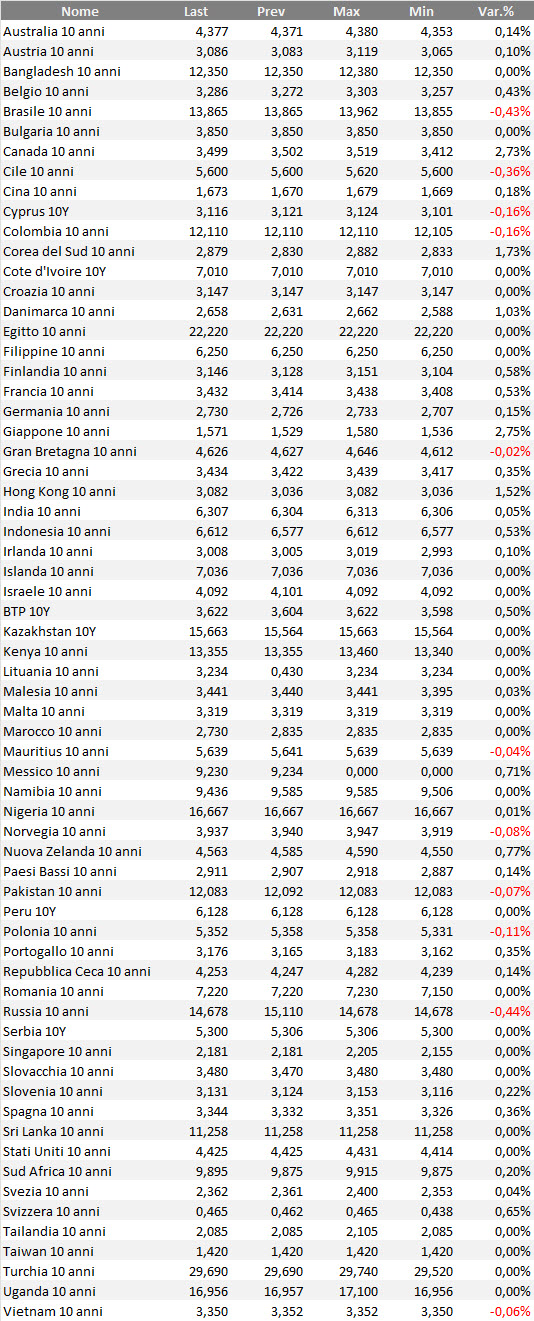Tabella dei rendimenti, su base settimanale, delle obbligazioni governative mondiali con qualunque rating. Il ranking considera i bond benchmark decennali in tutte le valute di emissione. In alcuni casi, per alcuni emittenti o per alcune valute, il rapporto rischio/rendimento di questi bond può essere anche piuttosto speculativo.