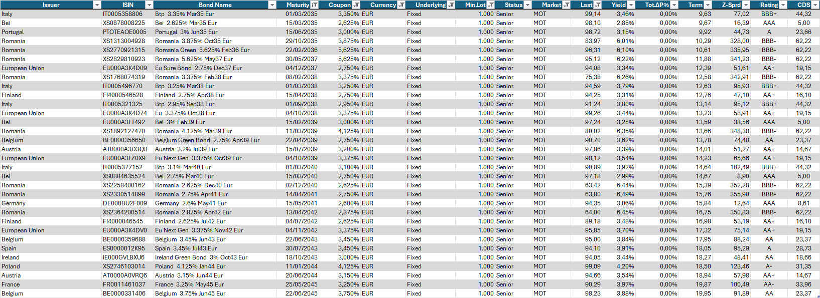 Qui sotto, a titolo di esempio l’estrazione di governativi e sovranazionali con diversi gradi di rischio emittente e con scadenze dal 2035 al 2045, tratto di curva con i maggiori rendimenti. Porre attenzione al fatto che all’aumentare della scadenza aumenta la duration e di conseguenza il rischio tasso in caso di turbolenze sul fronte dei tassi.