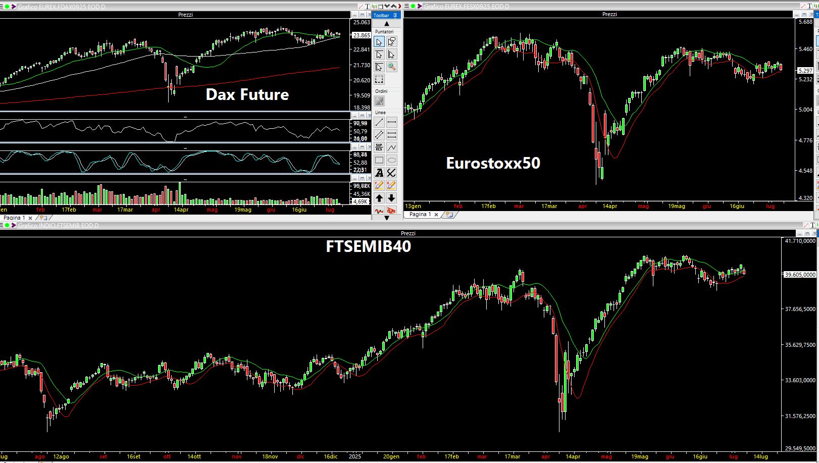 Come già scritto nel titolo di questo articolo, l'Europa in questa fase sta arrancando parecchio, forse per il discorso dei dazi per i quali deve essere ancora presa una decisione e per l'Europa il 9 luglio è dietro l'angolo. Poi sapete meglio di me quanto il vecchio continente sia lento nel legiferare, nel prendere decisioni e con Trump l'unica soluzione rimane la genuflessione. In questo però siamo i primi della classe. Tornando agli indici europei e alla loro lateralizzazione basta osservare il Dax piuttosto che l'Eurostoxx50 o il FTSEMIB40: trend choppy ed estremamente laterale su tutto. L'aspetto positivo è che ciò avviene sui massimi (accumulazione???), quello negativo che potrebbe anche trattarsi di una fase distributiva. Insomma, l'esatto contrario per intenderci. Il problema grosso sono i volumi che mancano completamente e questo potrebbe non deporre a favore dei rialzisti.