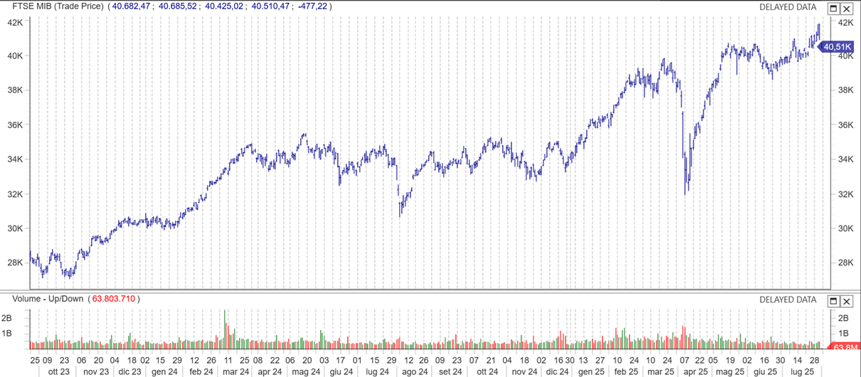 L’ indice domestico italiano Ftse MIB 40 “drogato”dai bancari ritornati in spolvero dopo l' annuncio di Unicredit che rinunciava (per il momento) all' operazione BPM potrebbe ripiegare anche in considerazione del fatto che in tanti investitori che partono per le ferie “portano a casa”.