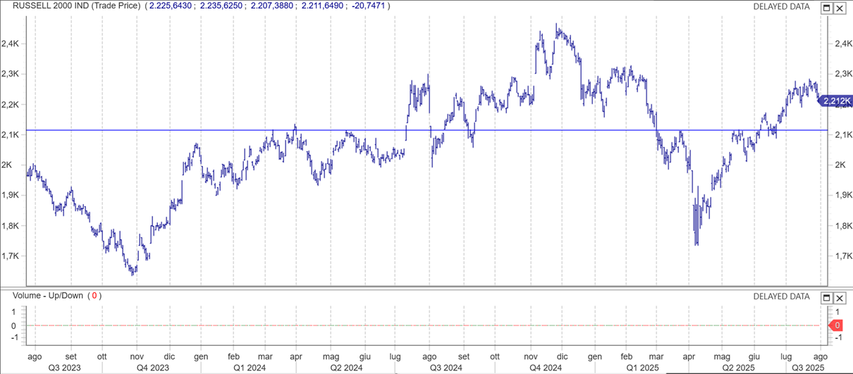 In questo contesto posso notare come ad esempio il Russel 2000 dia segni di “affaticamento”che potrebbero portarlo a testare l’ importante rottura al rialzo dei 2100 punti