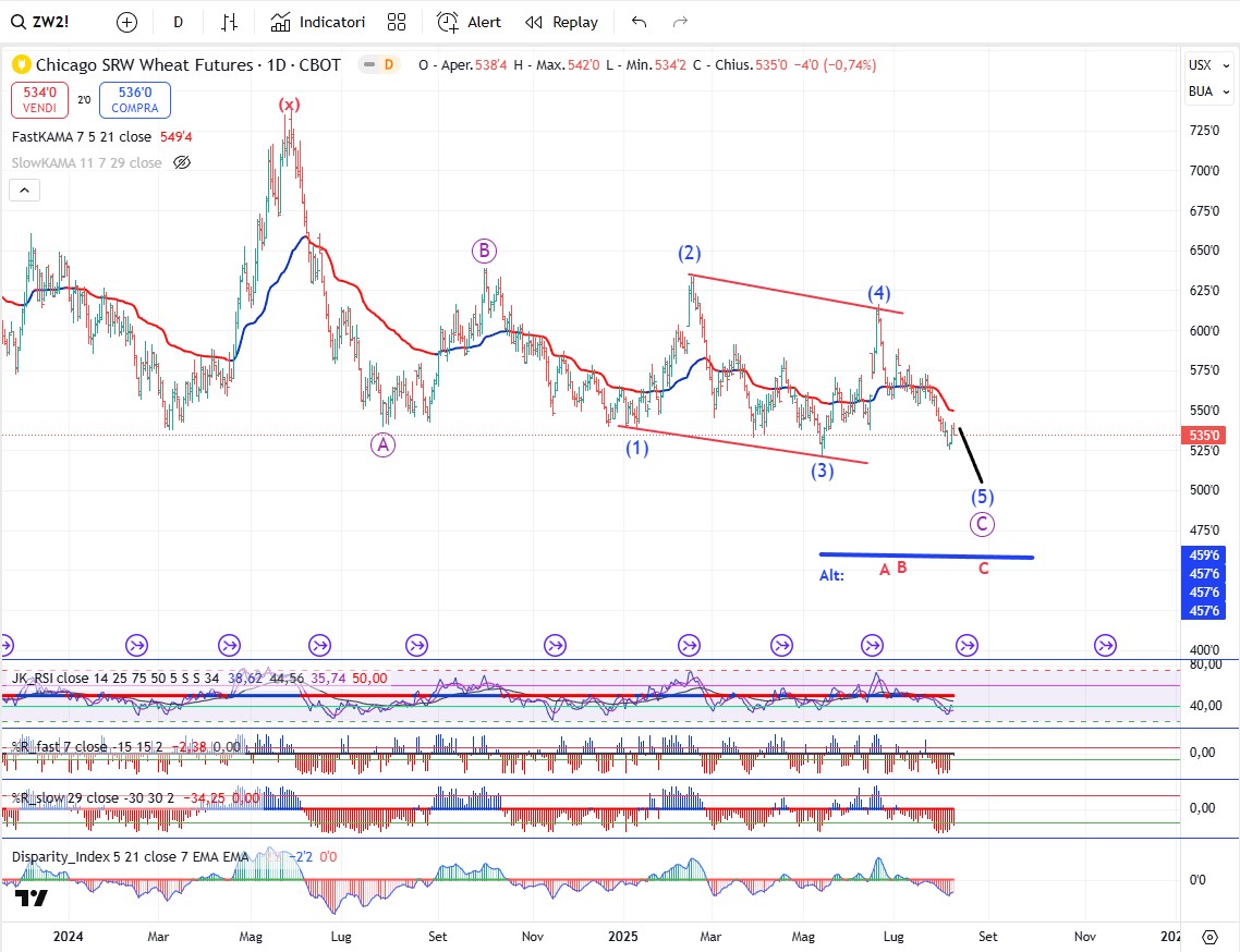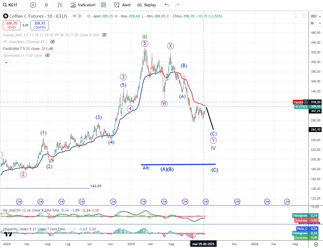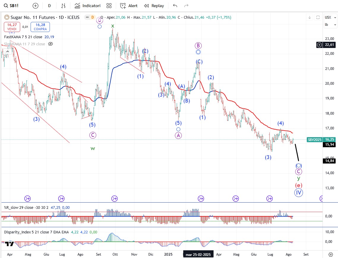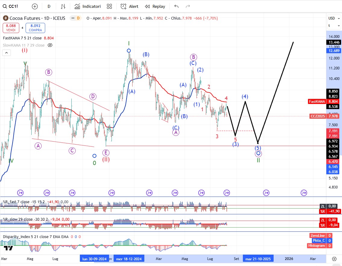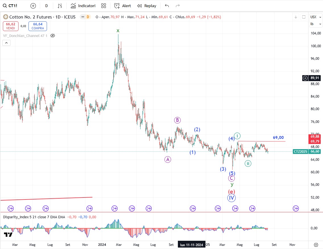 In generale tutto il comparto delle soft commodity si trova nelle fasi finali di un trend ribassista che in linea di massima dovrebbe concludersi da qua a fine anno o inizio del 2026. Dopo tutto il comparto dovrebbe avviare una fase rialzista della durata di parecchi mesi.