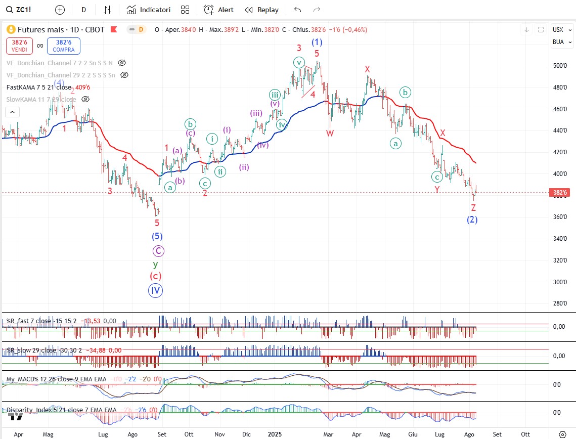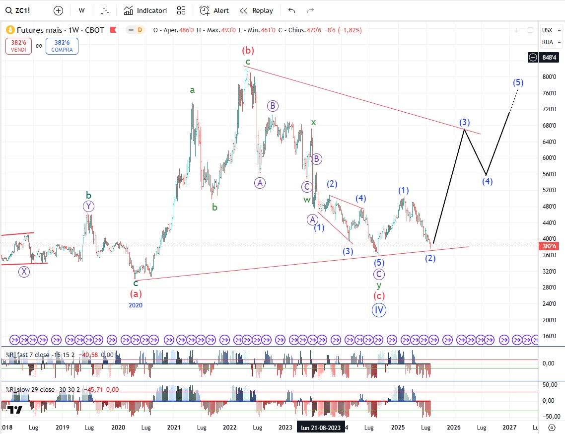 Sul mais diventa fondamentale la tenuta del minimo di onda (5) per confermare che il trend rialzista è iniziato. Se l’onda (2) dovesse continuare a scendere rompendo al ribasso il minimo di onda (5) (ovvero l’origine di onda (1)) allora significherebbe che il trend ribassista non era ancora terminato e che una ulteriore suddivisione al ribasso era necessaria.