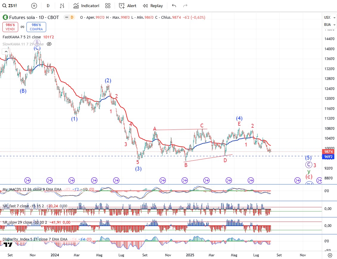 Anche la soia sta sviluppando l’onda (5) ribassista che come tempistica potrebbe viaggiare con gli stessi tempi delle soft commodity.