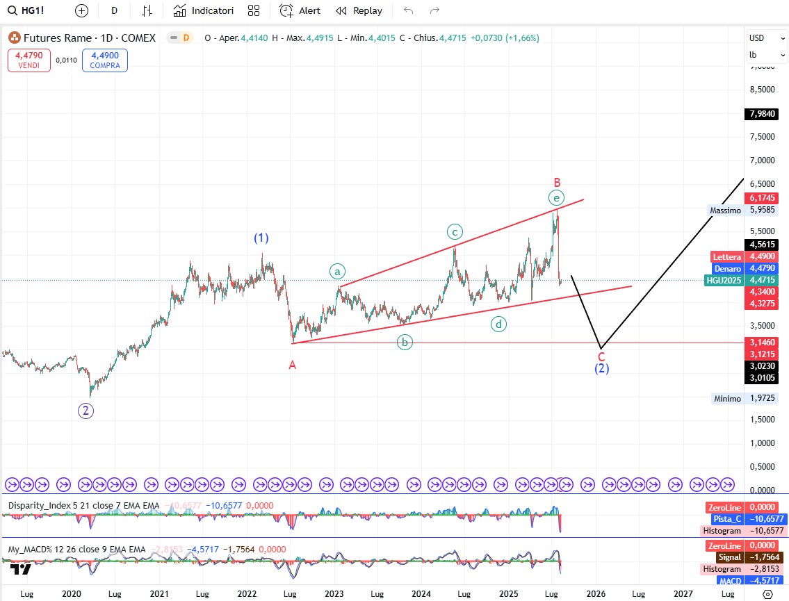 Sul rame se quello che si sta sviluppando è un flat espanso l’onda C in corso dovrebbe terminare leggermente sotto al minimo si onda A. L’onda C potrebbe terminare prima nel caso di un run away flat, ma sono casi meno frequenti. Considerato il numero di volte in cui il rame si mosso diversamente da quello che ci aspettavamo non farei comunque molto affidamento sulle etichettature che sto ipotizzando almeno fino a quando non avremo delle conferme a queste ipotesi.