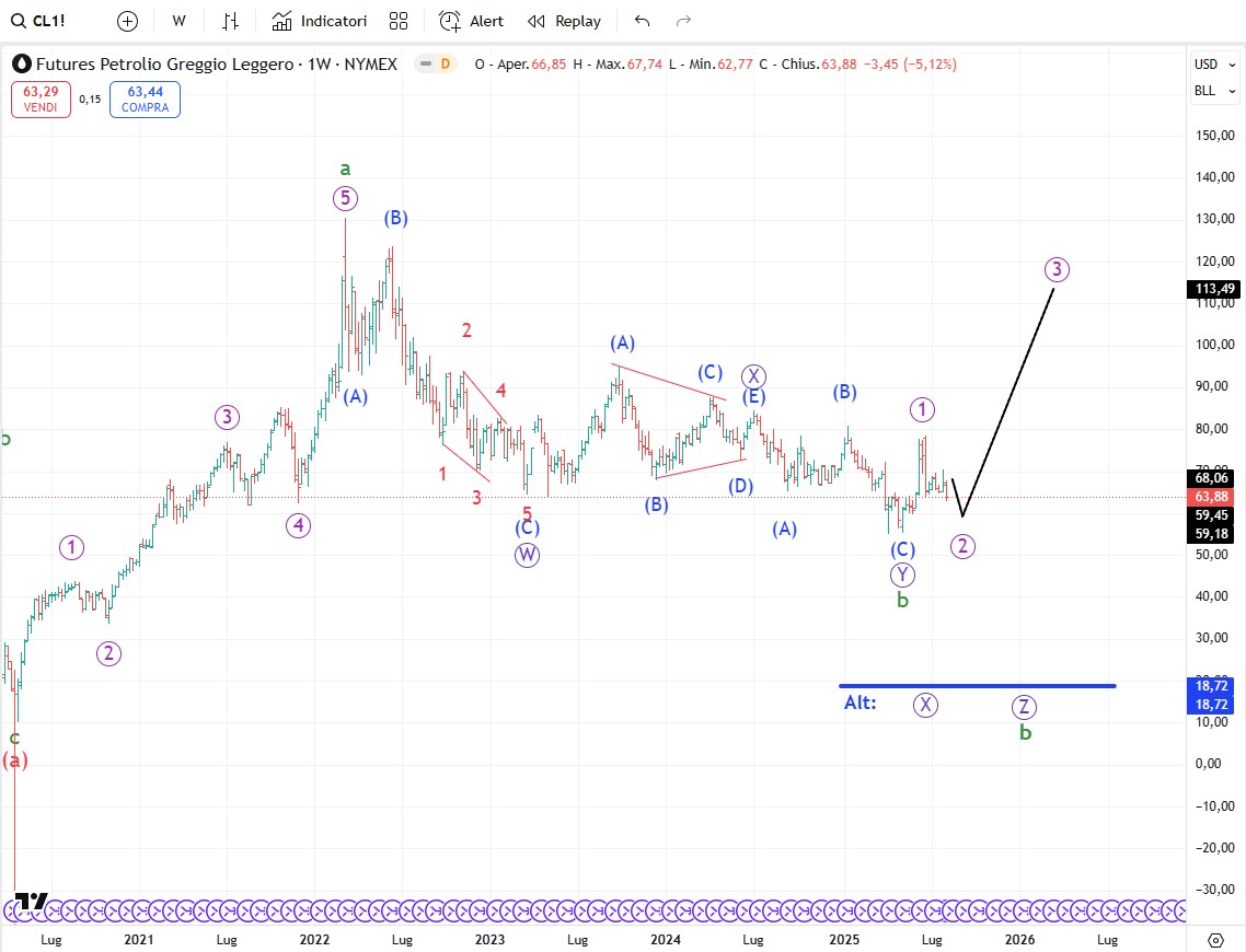 Il greggio deve scendere a completare l’onda [2] in atto prima di poter puntare ad un rialzo che riporti i prezzi verso i 100$ al barile.
