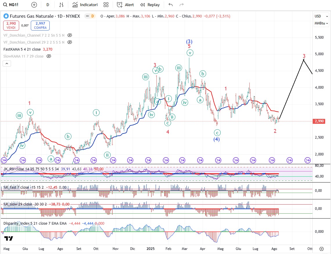 Sul gas naturale l’onda 2 potrebbe essere terminata e se è così i prezzi dovrebbero iniziare a crescere. Se invece quel minimo non dovesse tenere allora una ulteriore gambetta ribassista si dovrà sviluppare per chiudere l’onda 2 su livelli di prezzo più bassi.