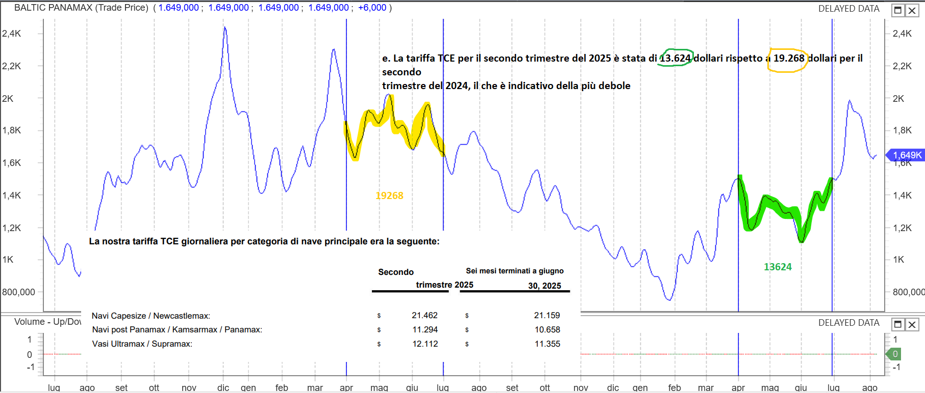 Alcune settimane fa avevamo sottolineato come il prezzo dei noli fosse in ripresa dopo il forte ribasso di dic 2024 - feb 2025 e nel grafico sottostante abbiamo evidenziato l indice Baltic Panamax nel periodo Q1 24 e Q1 25 e incollato due frasi della trimestrale SBLK. Alla luce di ciò plausibile aspettarsi un buon miglioramento dei profitti nella prossima trimestrale.