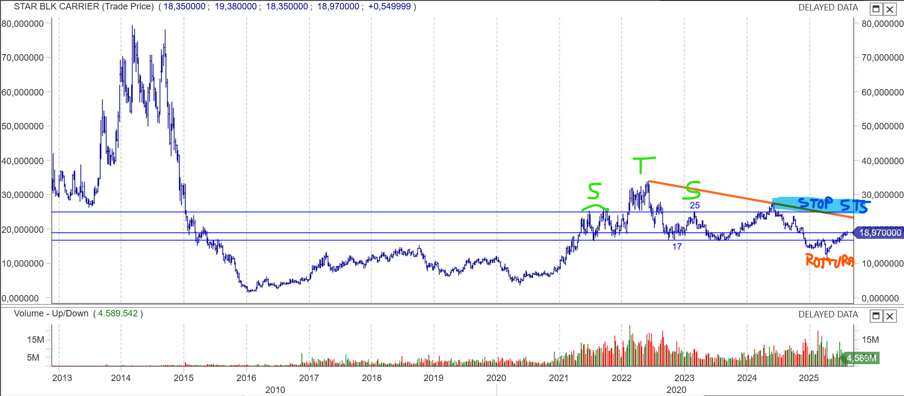 SBLK se la osserviamo nel lungo periodo, sembrava avesse formato ed innescato un testa e spalle ribassista STS , ma i corsi hanno recuperato la nek line ma non annullata la figura stessa che sarebbe tale al superamento dell altezza della spalla destra (STOPSTS).