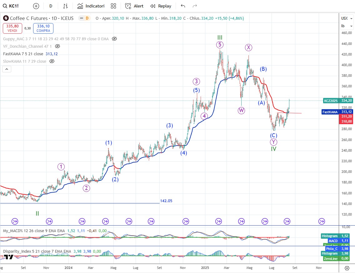 Rianalizzando il grafico del cacao questa settimana proviamo ad ipotizzare la conclusione dell’onda II sul minimo del 17 luglio. In questo modo l’onda [C] sarebbe un ending diagonal e il rialzo che parte dal 17 luglio l’inizio dell’onda III di grado cycle. Ora aspettiamo conferme. Se l’ipotesi è corretta il minimo del 17 luglio non sarà più infranto. Al contrario un nuovo minimo annullerà questa ipotesi.