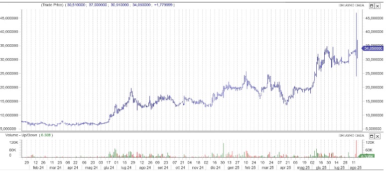 Un titolo USA sottilissimo, ma con un business scalabile. Quotazioni in ascesa, fino al colpo di scena: da 33 dollari schizza a 47, crolla a 24 e infine si stabilizza a 34.