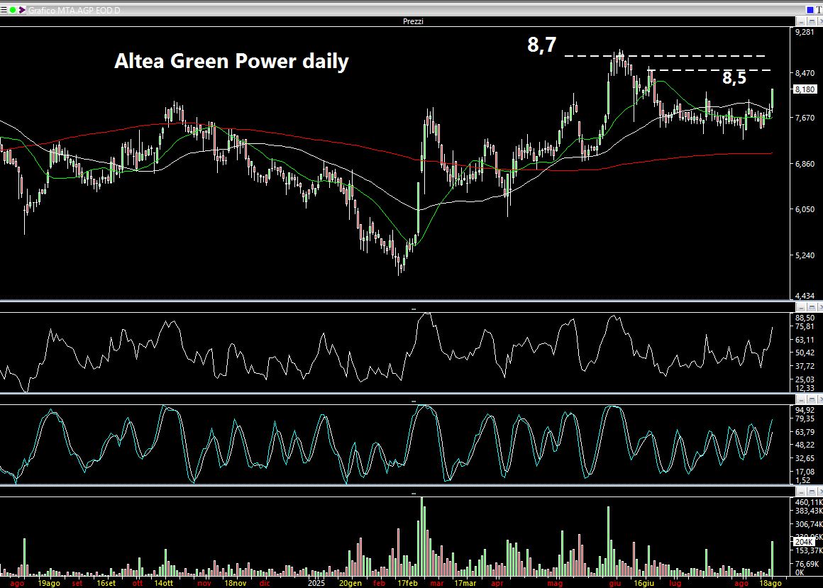 Nella seduta odierna ho visto ben comprate le azioni del settore dell'energie rinnovabili penso a titoli come Altea Green Power piuttosto che Alerion o Redelfi che entrano nella mia watchlist di breve termine. Tengo a precisare che si tratta nel complesso di azioni tendenzialmente ILLIQUIDE anche se nella seduta odierna i volumi sono stati decorosi (Altea Green Power ad esempio ha scambiato circa 200mila pezzi per un controvalore di circa 1,6 milioni di euro, ma giovedì scorso i volumi erano stati di soli 45mila pezzi!!! Quindi il rischio di rimanere potenzialmente incastrati o soggetti a spike improvvisi (=salto di stop loss ad esempio) rimane elevato). Se il breakout odierno venisse confermato da volumi continuativi il titolo in questione potrebbe puntare nuovamente verso 8,50 euro e poi verso l'area 8,70 rispetto al close odierno a 8,18. Brutto un rientro sotto 7,70 circa.