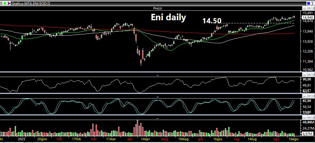 Su Eni l'asticella dello stop era stata alzata a 14,40 euro. Seppur do poco, la alzerei a 14,50 euro market on close (in caso di assenza di notizie specifiche sul titolo o sul petrolio naturalmente! Qualora ci fosse una qualche forma di accordo tra USA+Ucraina+Russia ed UE e vedessi l'oil scendere a rotta di collo lo stop potrebbe essere valido per l'intraday, in modo da filtrare in qualche modo la volatilità da notizia).