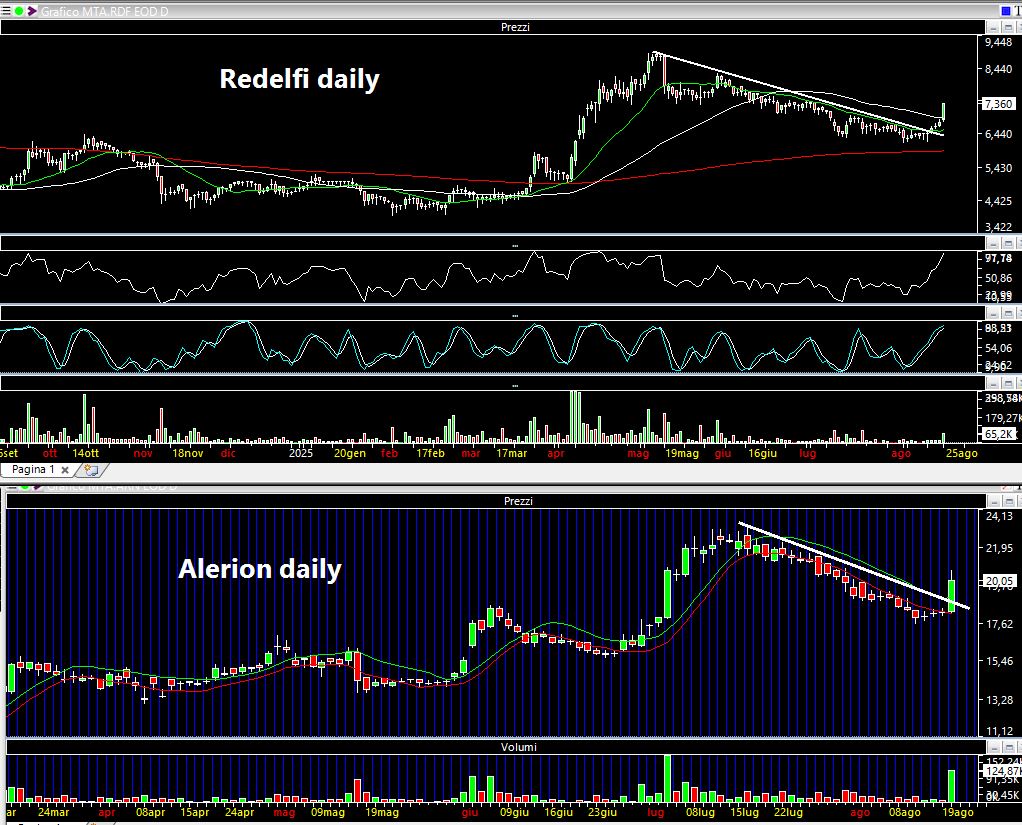 Grafici simili sia per Redelfi che per Alerion: entrambe hanno rotto una trendline dinamica discendente di lungo periodo. La prima, Redelfi, ha scambiato 65mila azioni (controvalore di circa 450 mila euro) mentre la seconda, Alerion, ha scambiato 124mila azioni per un ctv di circa 2,5 milioni di euro. Sarà interessante vedere se e come "digeriranno" il rialzo odierno dopo circa due lunghi mesi di ribasso. Scenario rialzista potenzialmente invalidato qualora le azioni menzionate tornassero al punto di partenza, cosa pur sempre possibile in questi mercati governati da software. Oggi c'era l'ordine, domani forse non più. Continuo a fidarmi molto poco, quindi queste sono le classiche situazioni che mi fanno vivere alla giornata, almeno per ora.