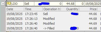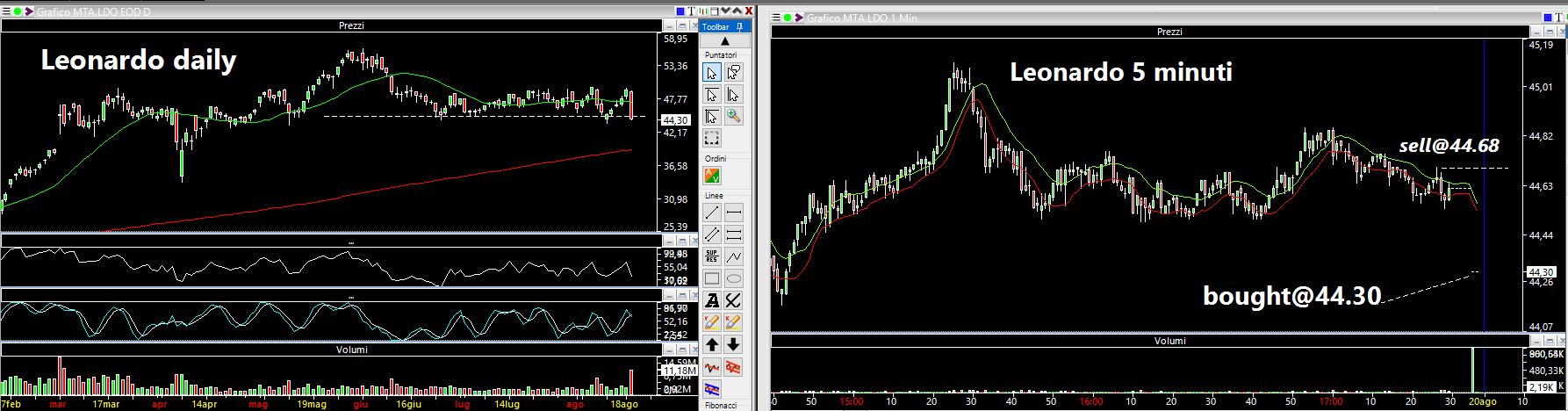 In questo contesto, operativamente parlando, il mio suggerimento è quello di non avere mai paura nel fare clic, specialmente quando i titoli sono stra venduti come successo appunto a Leonardo oggi...azione che da sola ha fatto un sesto degli scambi complessivi a Piazza Affari. Per non avere paura credo occorrano due cose: prima di tutto una idea (avvalorata dal movimento del titolo) e poi la size ridottissima. Anche shortare a -9% può valere la pena se si pensa che la discesa possa proseguire fino alla chiusura...e la chiusura di seduta costituisce lo stop del trade. Così è stato proprio per Leonardo, con un sell preciso favorito dall'aver individuato una macchinetta che scavallava gli ordini mettendosi sempre prima in book fino a far incrociare una determinata size. Nessuno le vieta, non so se per connivenza, per mancanza di strumenti o per mancata conoscenza di come operano, e dunque in ottica opportunistica ci si accoda alla macchinetta: un software volumetrico tarato con quella modalità (sempre primo incrociando ordini, non si sa bene con chi) probabilmente scaricherà ancora di più nel finale. E così è stato. Sell dunque a 44.68 e ricopertura pochi minuti dopo a 44.30. Non importa se siamo a -8.5%! I software sono fatti per non ragionare (e per creare danni al sistema aggiungo io).