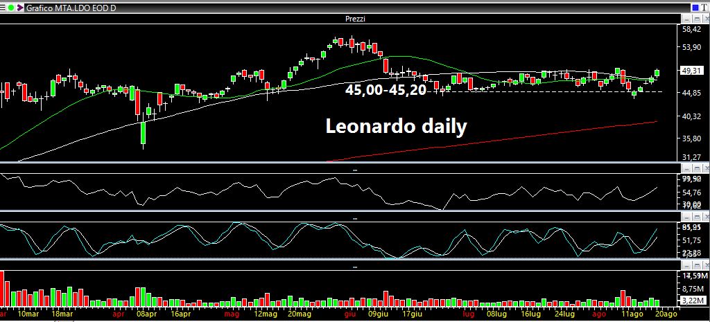 Nell'articolo di ieri sera ho menzionato Leonardo, mettendo in evidenza come lunedì della scorsa settimana ci fosse stata una apertura in gap down subito ricoperta sia con una chiusura daily sul livello di 45-45,20 euro che con piccole candele rialziste lente e costanti nei giorni successivi. Il grafico di ieri poteva apparentemente sembrare interessante: mancata rottura del supportone e inversione fino a testare nuovamente l'area di resistenza. Questo il grafico di ieri:
