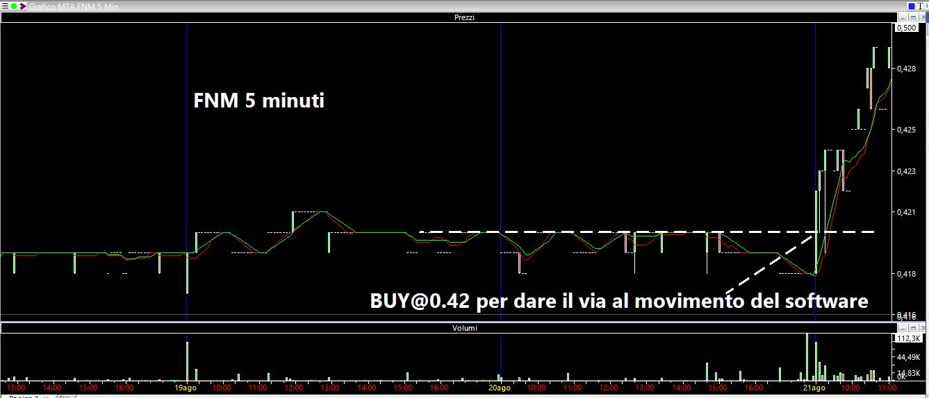 Nella seduta di giovedì individuo nelle primissime battute una macchinetta in acquisto su un titolo completamente ILLIQUIDO: Ferrovie Nord Milano (ticker FNM). Come ben sapete la mia titubanza nei trades di quest'ultimo periodo è ai massimi livelli. Sarà anche un bias cognitivo, ma questo è e non lo nascondo a chi mi legge. Il mio proposito, in un momento in cui non vedo trades eclatanti, è quello di fare con poco capitale le operazioni che passano nella mia testa, in modo tale da rischiare poco (=guadagnare poco) ma soprattutto non voglio darmi del fesso qualora si rivelassero profittevoli. Questo atteggiamento permette di migliorare la propria autostima che credo sia una componente fondamentale nell'attività di trading. Qui si tratta di psicologia e non di tecnica. Torniamo al punto iniziale: individuo un algoritmo tarato in acquisto su FNM e mi dico: diamo il via al movimento visto che chi lo ha progettato cercherà forse di scavallare gli operatori (esempio di manipolazione dei software). Procedo subito alle ore 9:00 con un acquisto secco @0.42 euro per 13mila pezzi circa. Il fatto che ci sia un quotatore che scavalla il bid (magari fino a un certo punto) o un software che compra è condizione necessaria ma non sufficiente per capire fino a quanto (o dove) lo farà. In altri termini mi fornisce l'indicazione per capire dove soffia il vento ma non mi dice se e quando quel vento cambierà direzione. Analizzo dunque Ferrovie Nord sul daily mentre sono in posizione e vedo che il titolo è praticamente in laterale dallo scorso anno e mi dico "adesso hai comprato a 0,42 euro, cosa ti aspetti che faccia considerato l'andamento dell'ultimo anno?". La mia risposta in realtà è stata "vediamo quando il software finirà di comprare" e così decido di rimanere in posizione. Questo il grafico daily che si presentava ai miei occhi