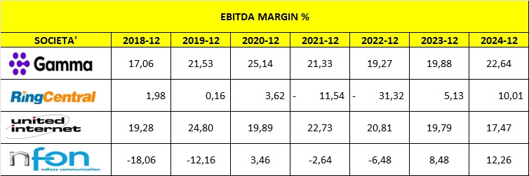 Qui la differenza è netta. GAMMA si muove costantemente sul 21–22%, mentre NFON e RingCentral restano su margini bassi o addirittura negativi. La tabella evidenzia bene come la società britannica giochi in un’altra categoria in termini di redditività, grazie al modello a ricavi ricorrenti e a una gestione prudente dei costi.