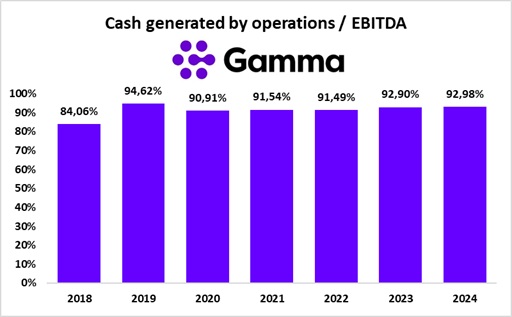 Il grafico che segue conferma un altro punto di forza: la capacità di GAMMA di trasformare l’EBITDA in cassa operativa. Dal 2018 al 2024 la cash conversion ratio (cash generated by operations / EBITDA) si è attestata tra l’84% e il 94%, con la parte più bassa nel 2018–2019 e un assestamento sopra il 90% negli ultimi anni. In termini pratici, questo significa che per ogni £100 di EBITDA, GAMMA ha portato a casa in media £92–93 in cash.