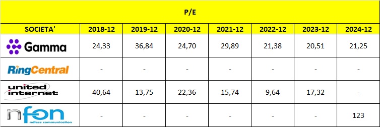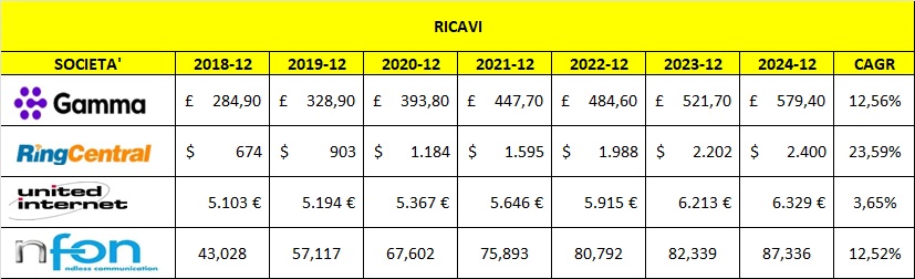 RingCentral, grande player globale UCaaS con ricavi nell’ordine di miliardi; NFON, operatore tedesco focalizzato sulle PMI in area DACH con scala ridotta.