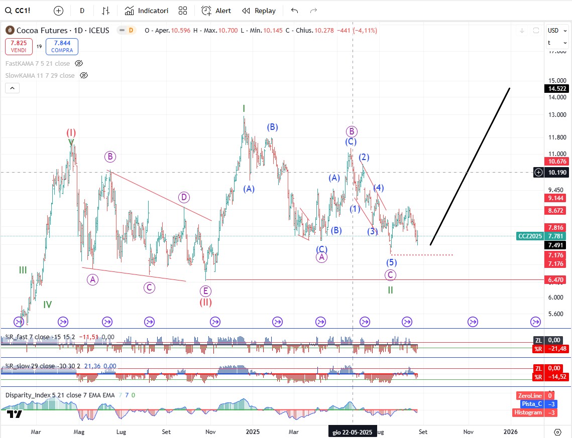 Sul Cacao per ora si conferma la nostra ipotesi di un grande Flat e l’inizio di un 5 onde rialzista. Solo il cedimento del minimo dal 17 luglio ci costringerebbe a rivedere il nostro modello.