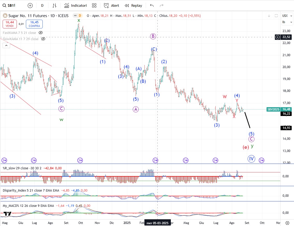 Lo zucchero continua a modellare l’onda (5) che è l’ultimo cinque onde del trend ribassista in corso. Dopo avremo alcuni anni di trend al rialzo.
