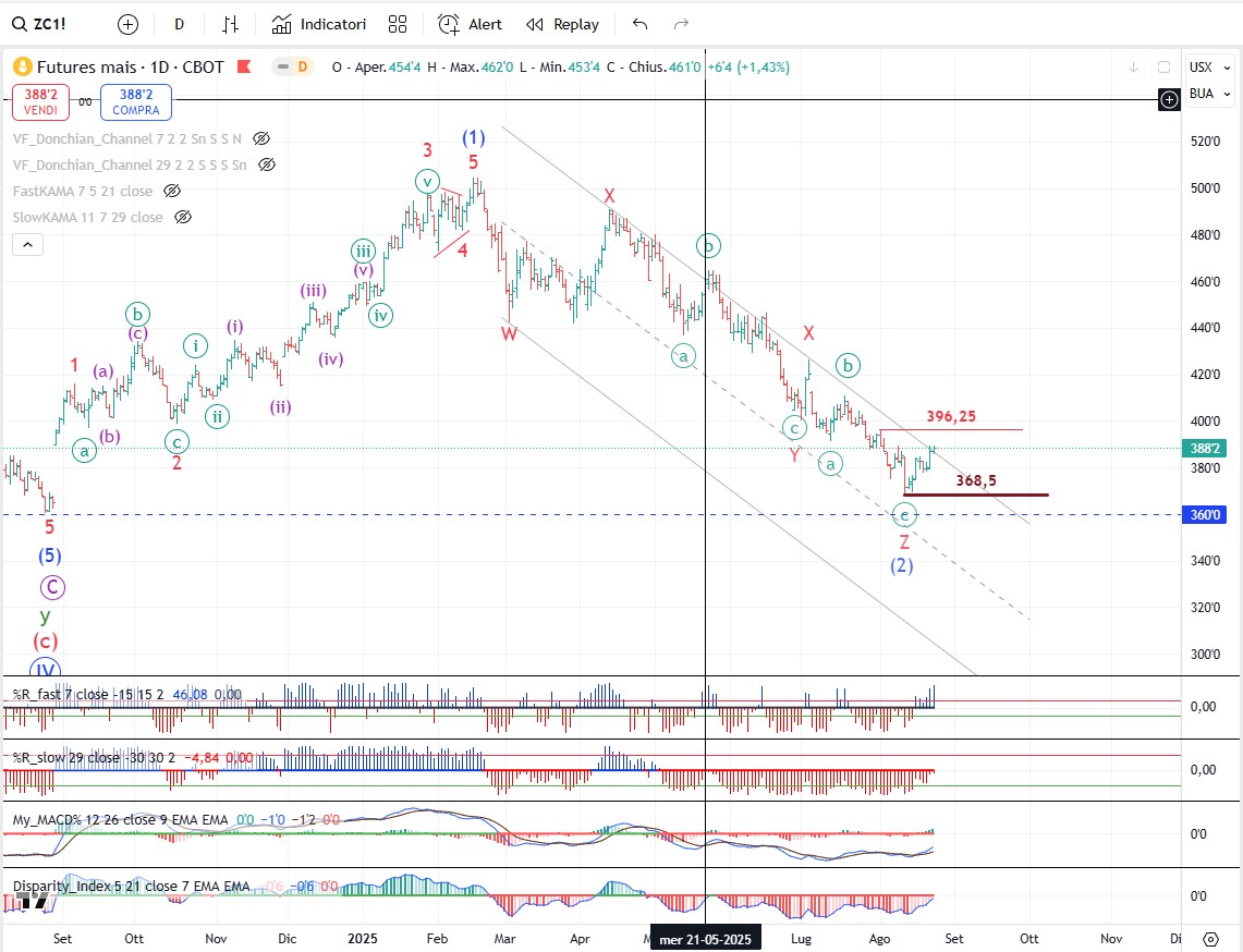 Il rialzo di questa settimana sul mais ci fa prendere in considerazione la possibilità che l’onda (2) sia terminata sul minimo del 12 agosto. A questo punto vorrei vedere superato al rialzo il massimo del 1° agosto a 396,25$ come conferma per aprire una posizione long con Stop sotto al minimo del 12 agosto a 368,5$.