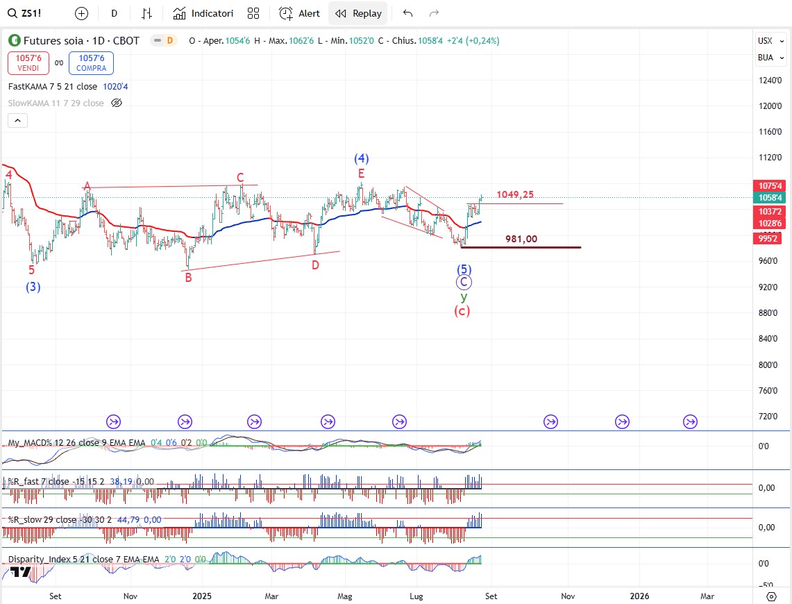Sulla soia siamo su un primo cinque onde rialzista e nonostante in portafoglio di soia ne abbiamo già la voglia di caricare un altro lotto è alta. Lunedi vediamo e deciderò.