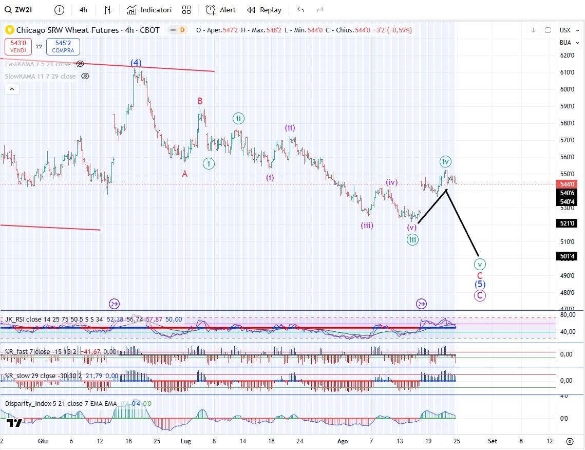 Sul grano le onde [iii[ e [iv] sembrano concluse e salvo smentite è in corso l’onda [v] al ribasso che dovrebbe concludere il trend ribassista sul grano.