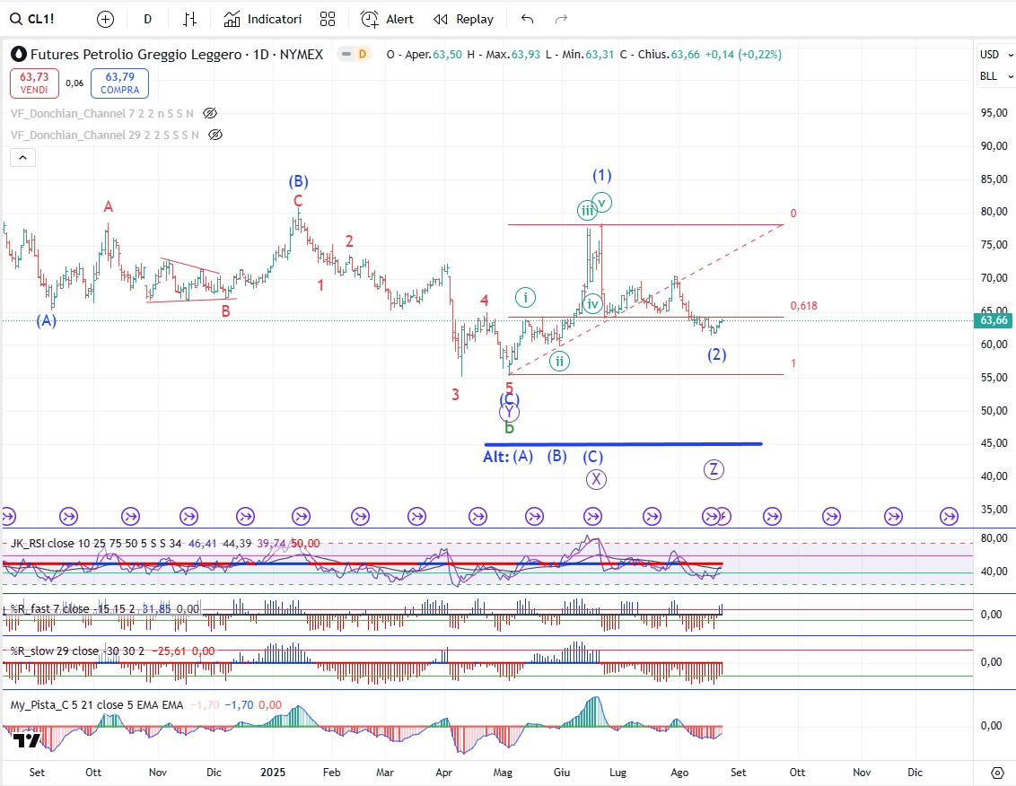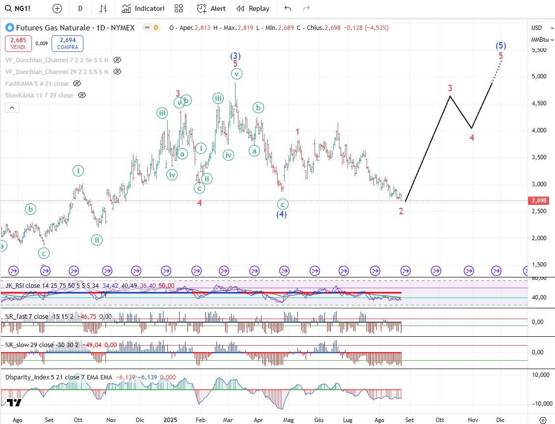 Anche sul gas naturale l’onda 2 ribassista dovrebbe essere conclusa e dovrebbe iniziare un cinque onde rialzista. Aspettiamo conferme prima di un eventuale rientro a mercato.