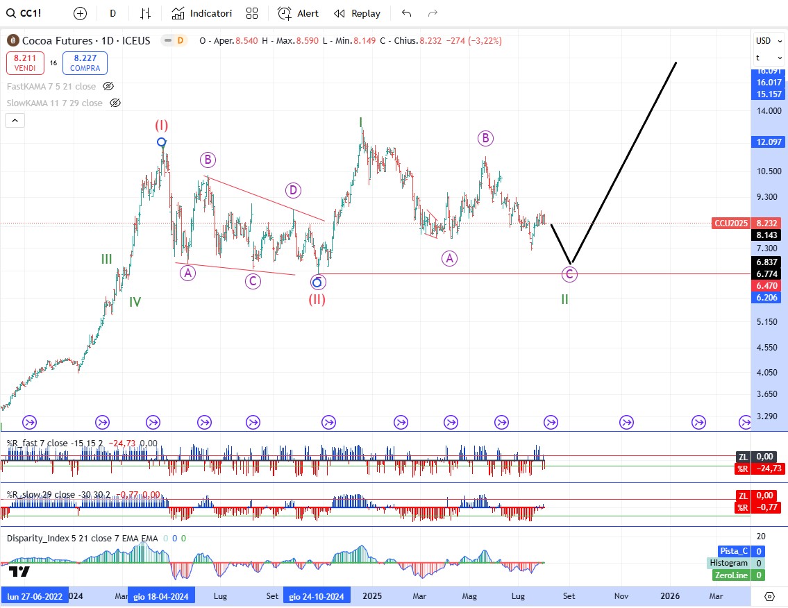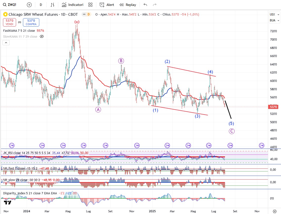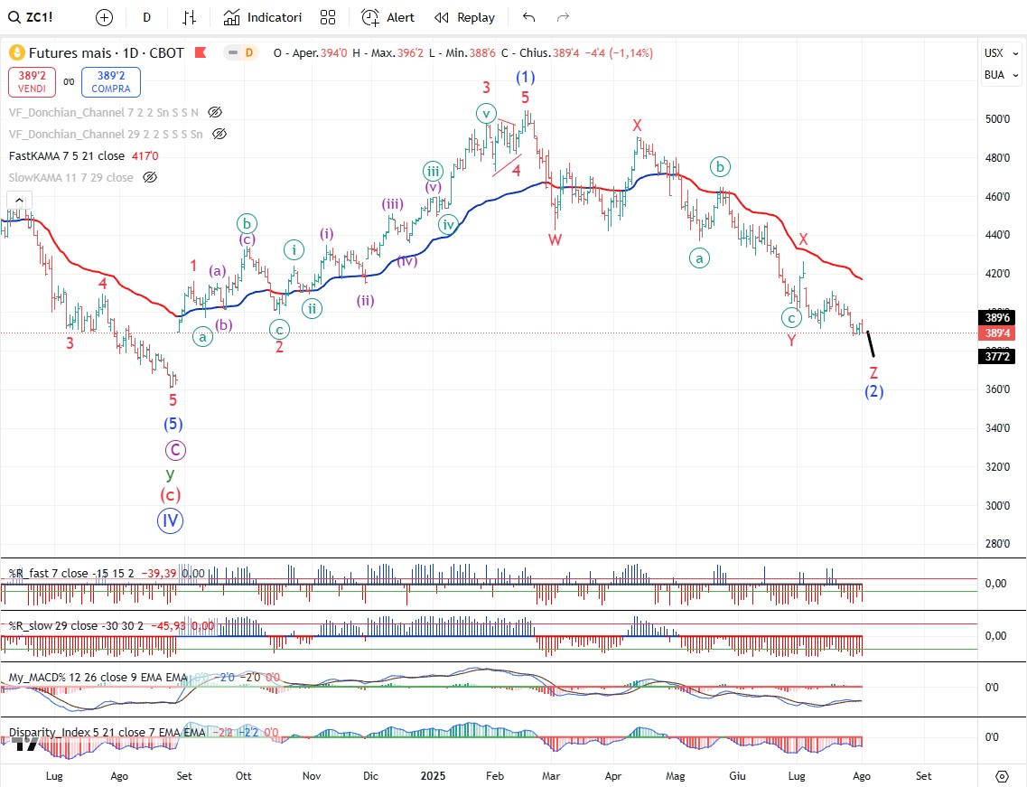 Ribasso agli sgoccioli anche per il mais che dovrebbe iniziare un trend rialzista di lungo periodo insieme a tutto il comparto dei grani in tempi abbastanza brevi (qualche settimana al più presto, fine anno/inizio 2026 al più tardi).