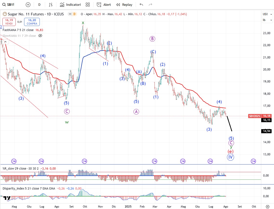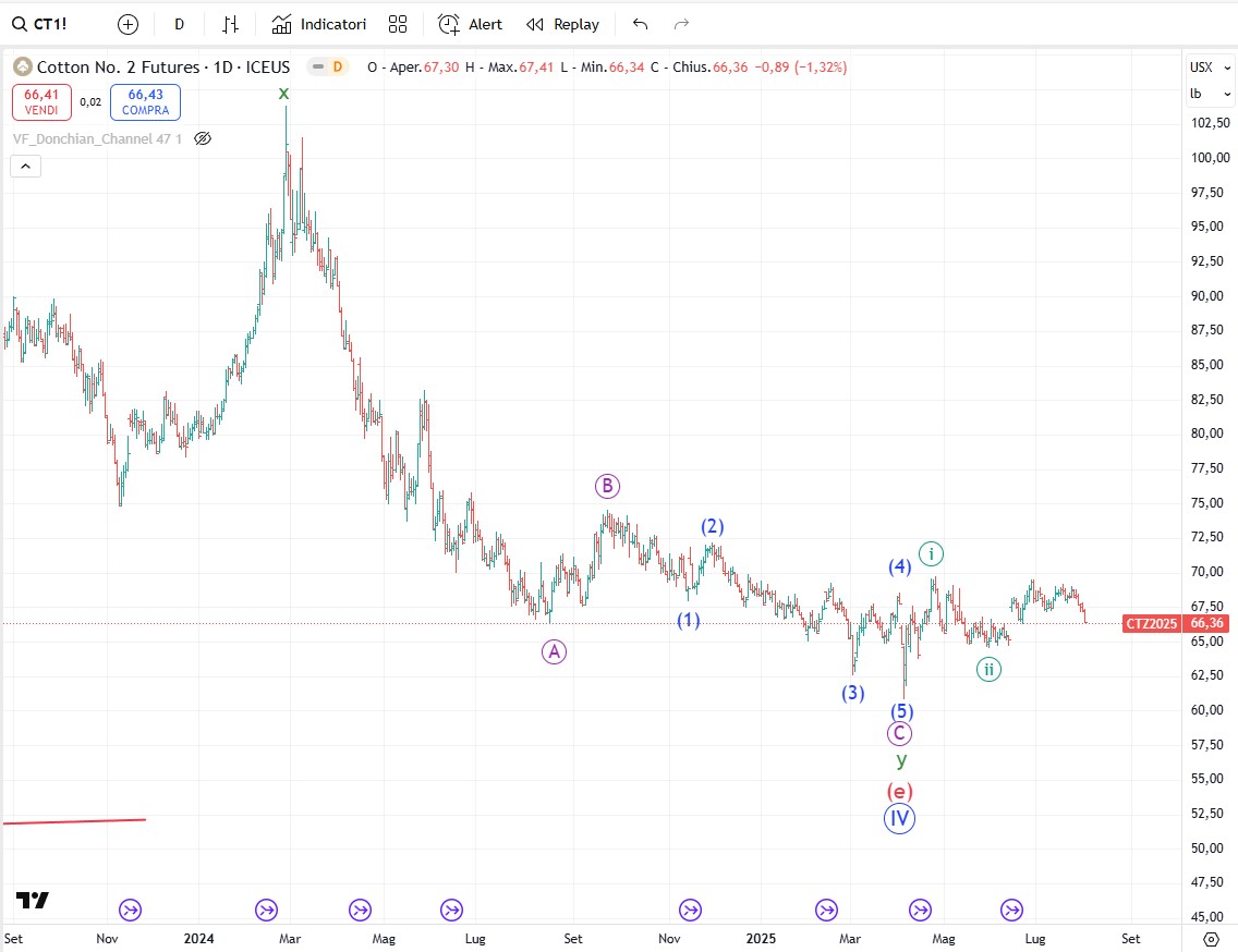 Sullo zucchero il modello è abbastanza simile al caffè. Se il ribasso è terminato sul minimo di onda (3) allora abbiamo già un primo 1-2 del nuovo ciclo rialzista. Se invece il minimo di onda (3) è nel posto giusto allora manca ancora un podi ribasso per considerare terminato il trend al ribasso.