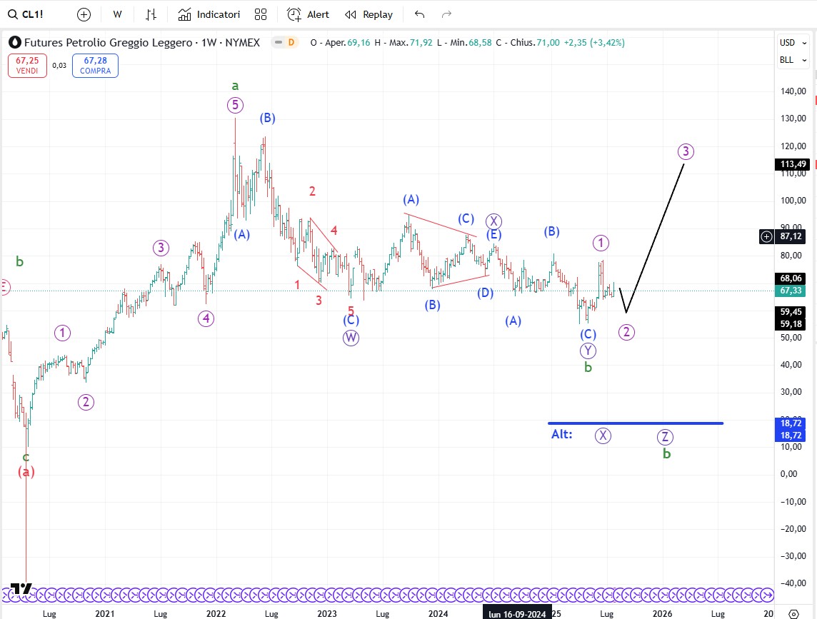Il Caffè continua a presentare il doppio scenario di segno opposto per cui restiamo ancora fermi. Come si vede confrontando l’etichettatura sul grafico e quella alternativa di sotto, entrambe le soluzioni sono compatibili solo che in un caso i prezzi devono scendere ancora un po', mentre nel conteggio alternativo il ribasso è concluso ed abbiamo già un primo 1-2 del nuovo ciclo rialzista.