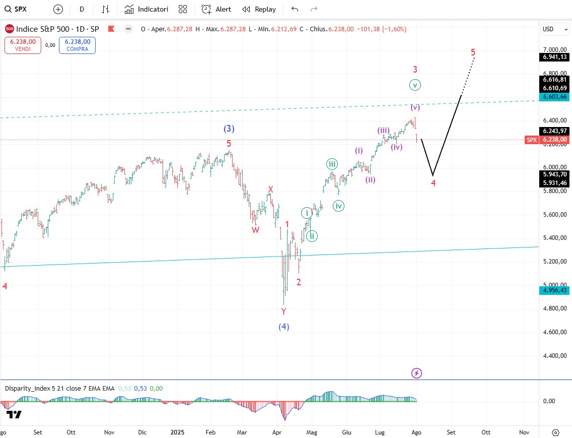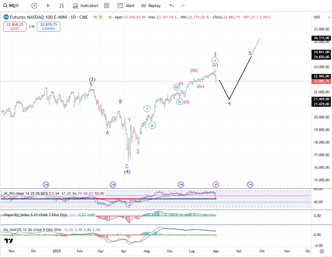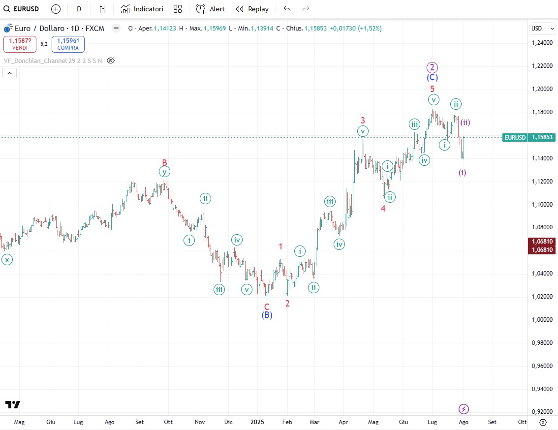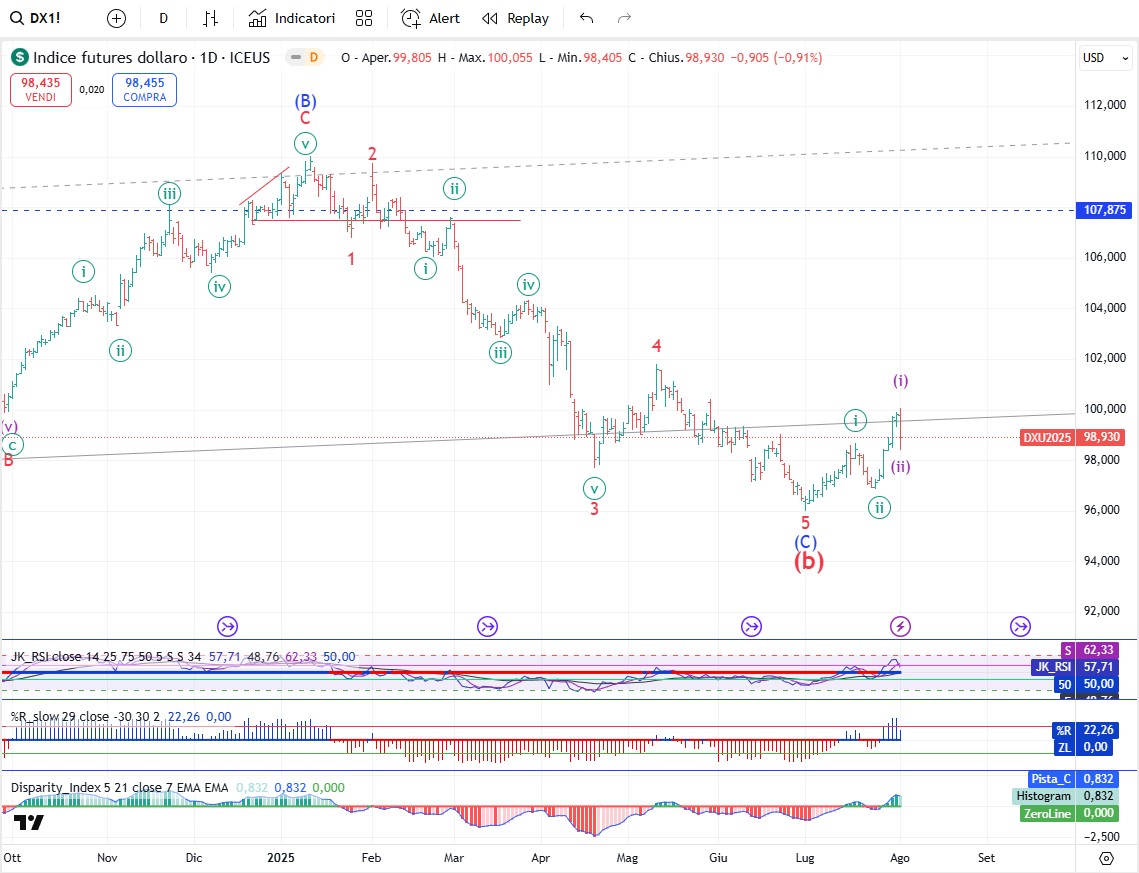 Sul Dollar Index gli investitori sono fortemente ribassisti ma noi sappiamo anche che un livello estremo di pessimismo spesso è compatibile con la fine di una quinta ondata ribassista. Il dollaro USA ha toccato il fondo il 1° luglio a quota 96,377 poi in un solo mese ha recuperato un ampio 3%. Il 1° luglio é la data in cui si è conclusa l'onda intermedia (C), completando un pattern a zigzag iniziato al massimo di gennaio 2022. Il dollaro USA quindi sembra essere in prima linea nel più grande rally dal massimo del 2022 e parliamo di un rally che dovrebbe durare diversi mesi. Poi al solito per non generare eccessivi entusiasmi dobbiamo anche valutare lo scenario alternativo. Lo scenario alternativo è che il massimo di onda 4 potrebbe essere l’onda [a] di 4, il minimo di onda 5 potrebbe essere l’onda [b] di 4 e il rialzo in corso l’onda [c] di 4. In questo caso il rialzo dovrebbe durare di meno ma comunque dovrebbe arrivare almeno in zona 100-101. A questo punto per un po' il dollaro deve comunque salire per cui non mi preoccuperei più del necessario.
