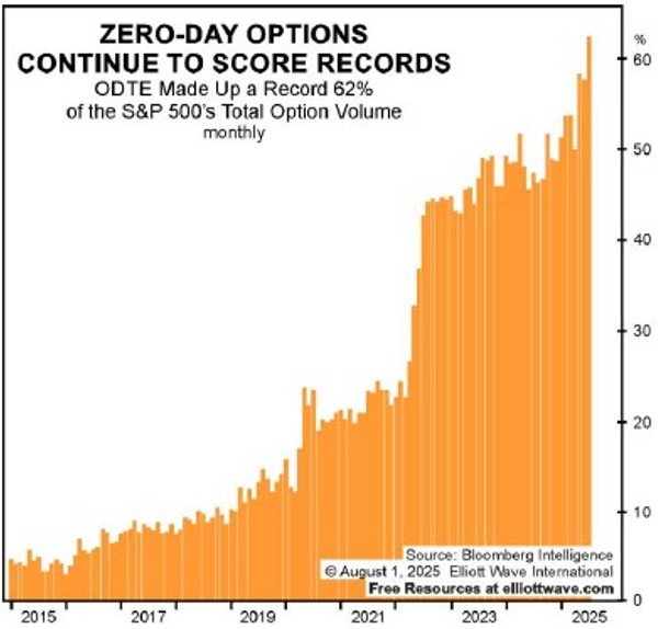 Visto che la fine di un mercato di Gran Super Cycle non capita molto spesso (in media ogni 200-300 anni) è interessante studiare la reazione psicologica degli investitori. Negli ultimi anni è cresciuta enormemente la domanda pubblica di opzioni che scadono entro 24 ore dall'emissione, e sono chiamate opzioni a zero giorni dalla scadenza (0DTE). Sul report mensile di Agosto Elliott Wave International pubblica un grafico di Bloomberg dove si vede che il 62% del volume totale delle opzioni scambiate sull’S&P500, sono opzioni 0DTE (un vero record).