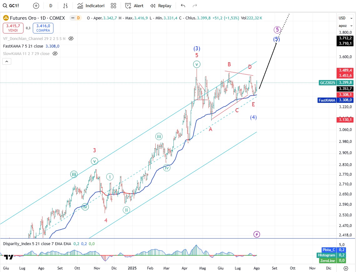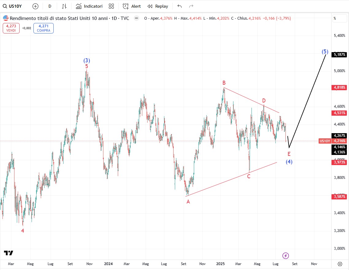 Come possiamo vedere sul grafico sopra i rendimenti stanno ultimando un triangolo che terminerà l’onda (4) pressappoco sotto 4,185% che è il minimo del 1° luglio. Dopo una volta terminata l’onda (4) i rendimenti saliranno di nuovo sopra al massimo di onda (3) che era il 5,021%.