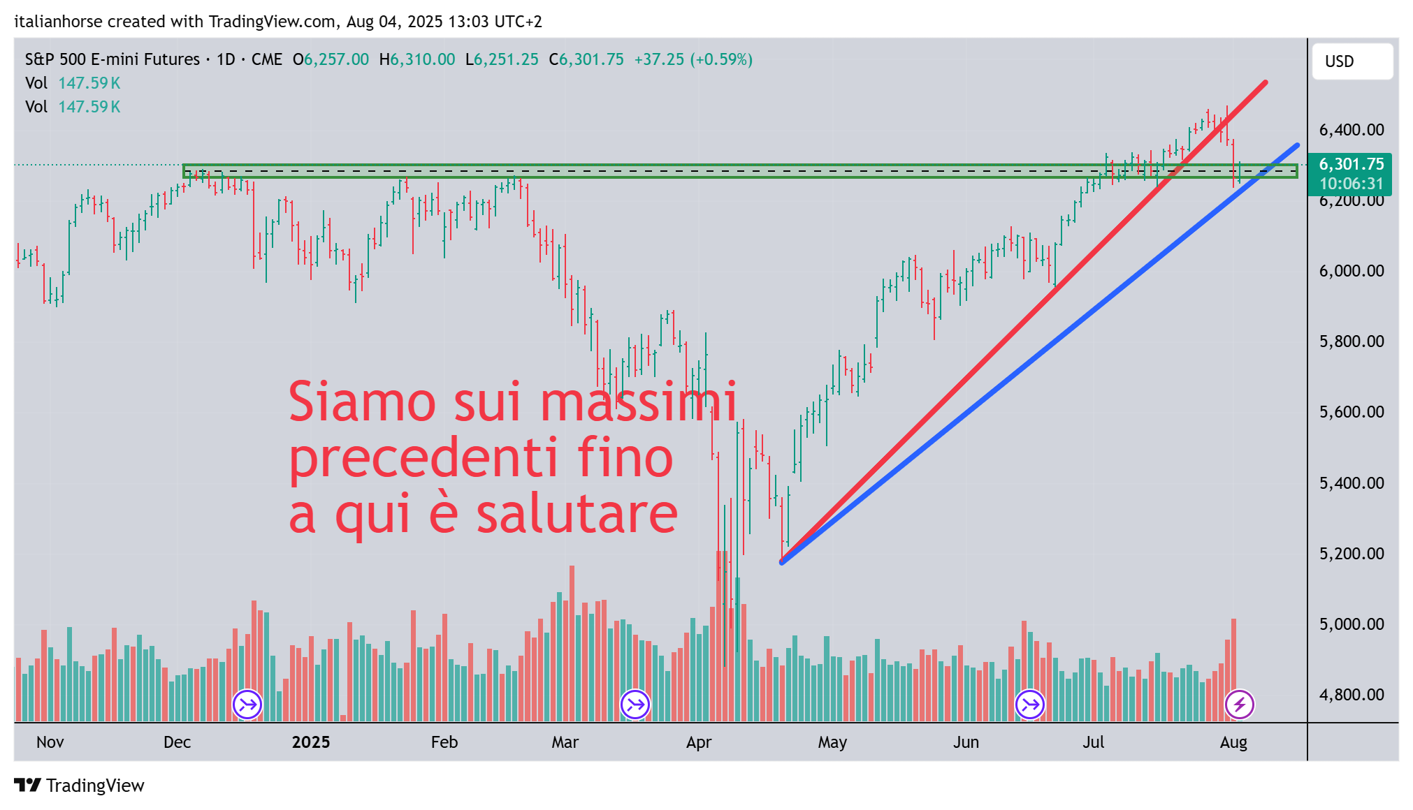 E torniamo all’aspetto tecnico: abbiamo avuto la rottura di una bella trendline rialzista che i prezzi avevano lambito diverse volte ma lo spazio per il ribasso è piccolissimo e l’impressione è che ci siamo già arrivati sul fondo del ritracciamento e siamo pronti pronti a ripartire. Nel grafico del futures emini SP500 che segue vedete la prima trendline rossa. Spesso in analisi tecnica bisogna immaginarsi il futuro e quindi molto probabilmente se regge questo supporto avremo una seconda linea crescente con un nuovo swing low (colore blue). Prima di suonare la grancassa del ribasso debbono succedere diverse cose tra cui i prezzi che scendono sotto i massimi relativi precedenti, un 1-2-3 ribassista, un doppio massimo un qualcosa che giustifica un movimento riabassista di mesi. Fino a quel momento dobbiamo rimanere rialzisti perchè non ci sono prove di ribasso.