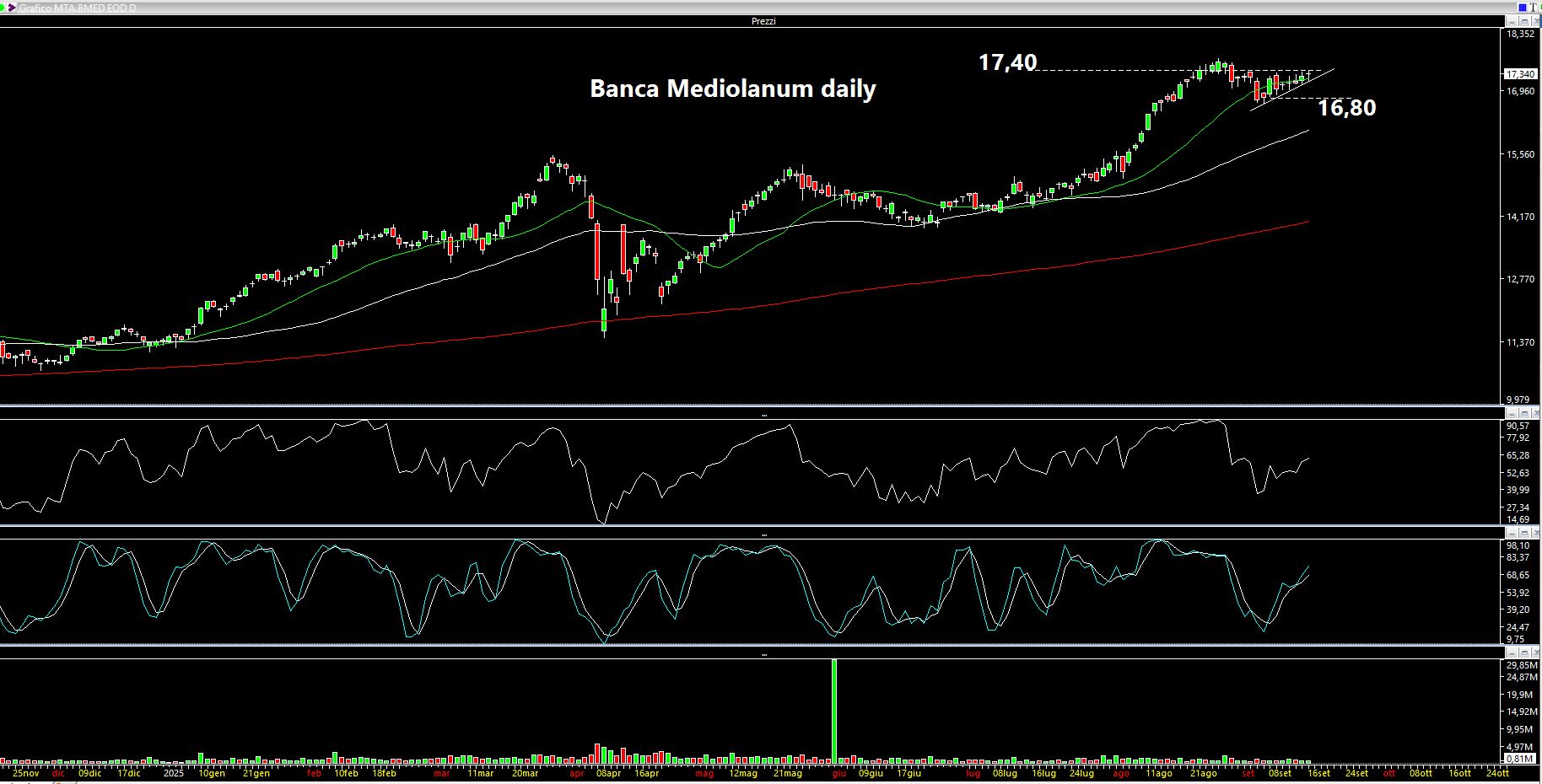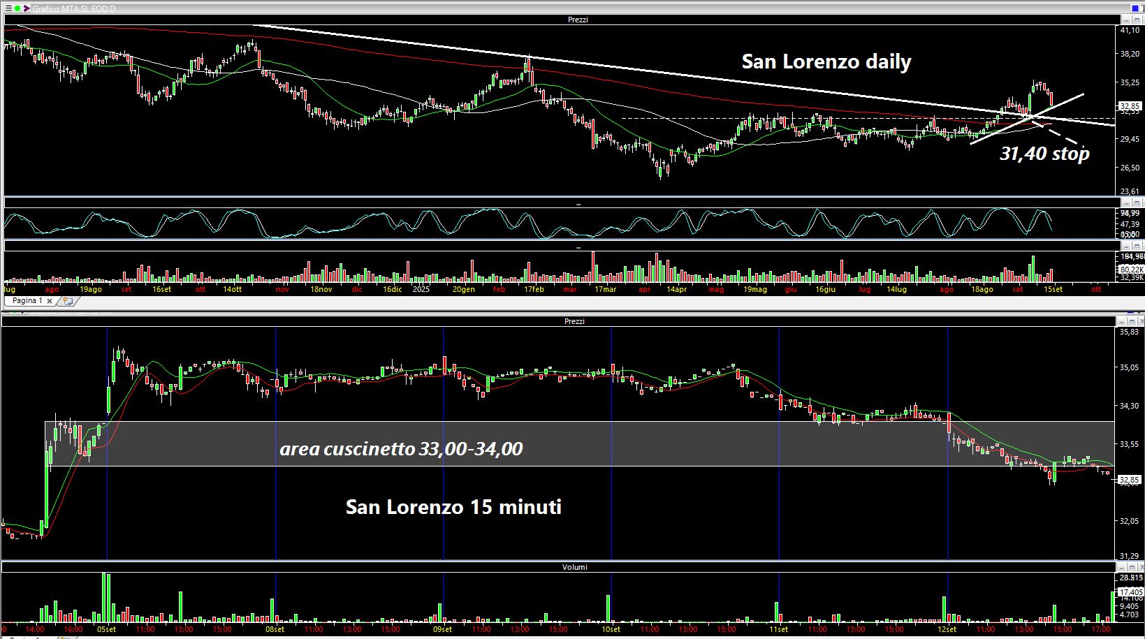 L'area cuscinetto compresa fra 33 e 34 euro ed indicata sabato scorso ha sostenuto il titolo nella seduta di giovedì ma non in quella di venerdì. Ipotizzando di aver acquistato proprio in questo intervallo e considerando che sul daily siamo su un supporto dopo la rottura della trendline discendente di lungo periodo manterrei lo stop a 31,40 euro così come già scritto la volta scorsa (link: https://www.lombardreport.com/2025/9/6/azioni-san-lorenzo/).