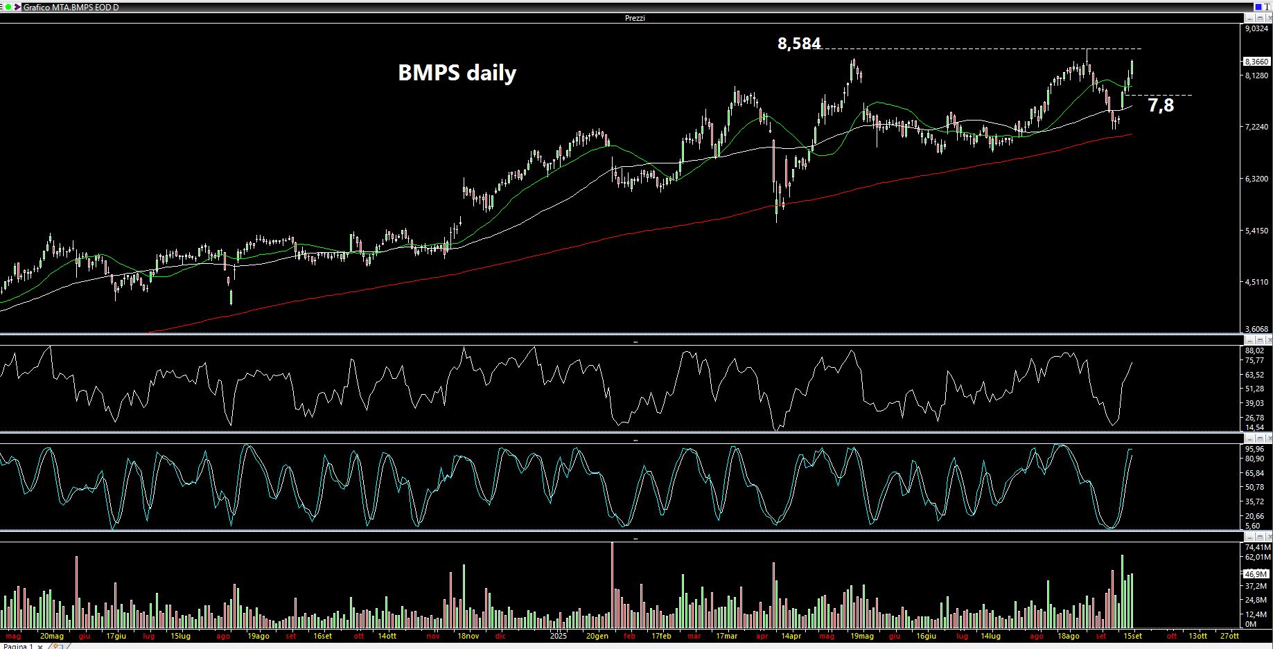 Ennesimo bluff? Sul rilancio di Mediobanca è crollata (e mi sarei aspettato almeno il test della mm200 che non c'è stato), poi quando le adesioni hanno superato abbondantemene il 50% è schizzata in su con un movimento a "V" che potrebbe non essere finito e non mi stupirebbe un ritocco degli ultimi massimi a 8,584 euro (poi si vedrà). Il close di venerdì è stato a 8,366 euro ad azione. Lo stop (che poi porrebbe un dubbio sul movimento a "V")? A 7,80 euro.