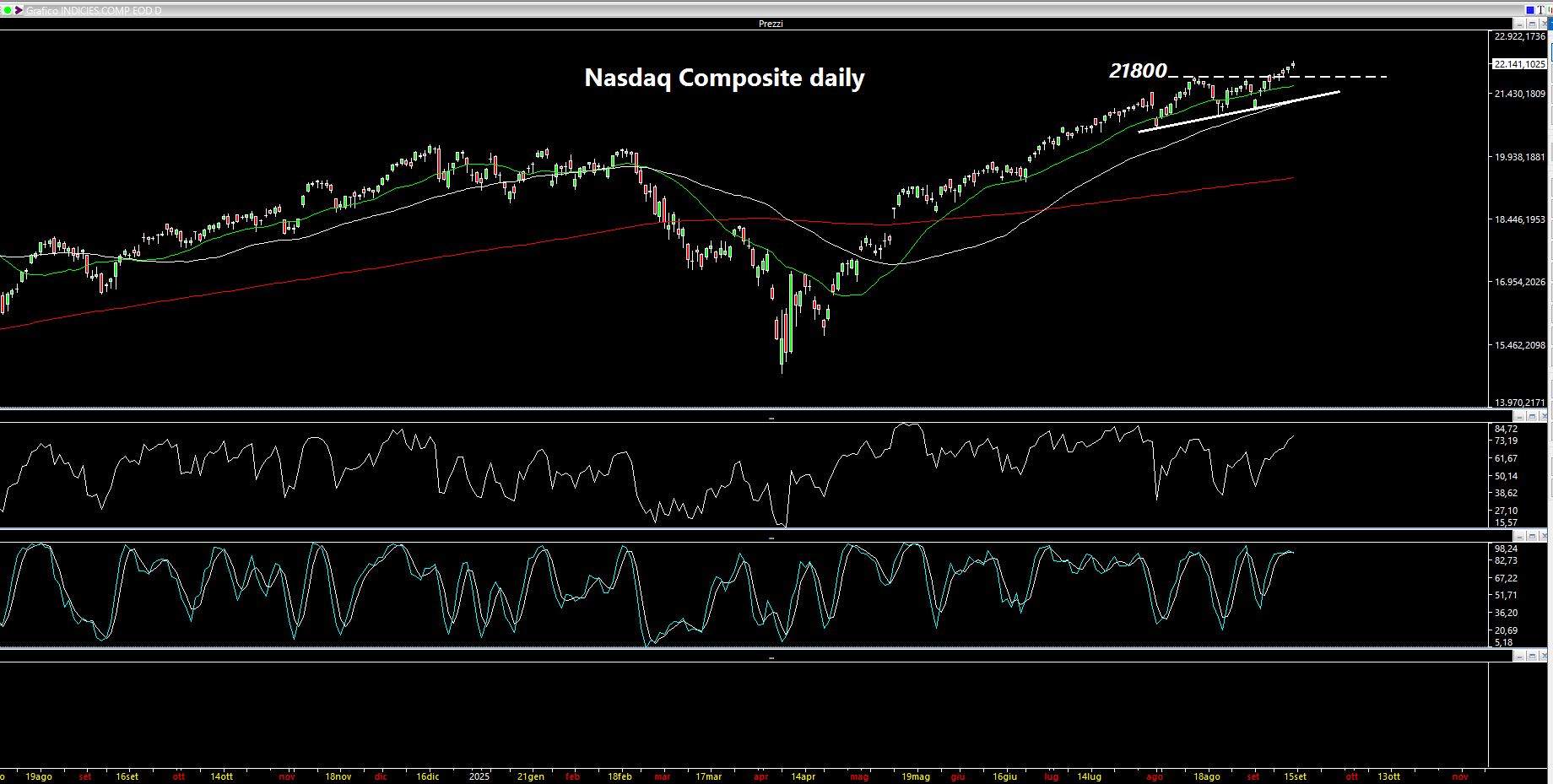 Nasdaq Composite: triangolo bucato verso l'alto (grazie al rialzo stellare di Oracle). Finché si rimane sopra i 21800 il semaforo rimane verde.