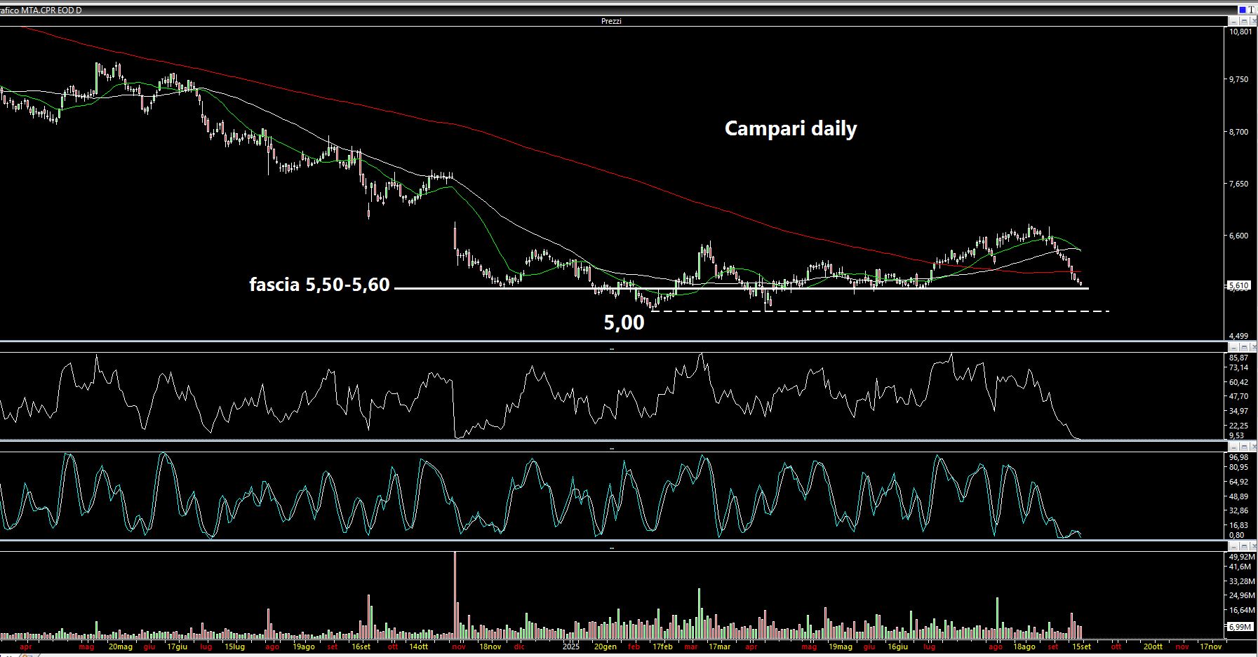 Azione che sembrava voler risalire e formare un rounded bottom. Si è riportata, con volumi crescenti nelle ultime sedute, verso la fascia a 5,50-5,60 euro che è un primo supportone. Sotto questo livello troviamo l'area 5 euro. Se i mercati dovessero stornare un pò (in assenza di news) potrebbe anche rimbalzare. La seguirò con quest'ottica.