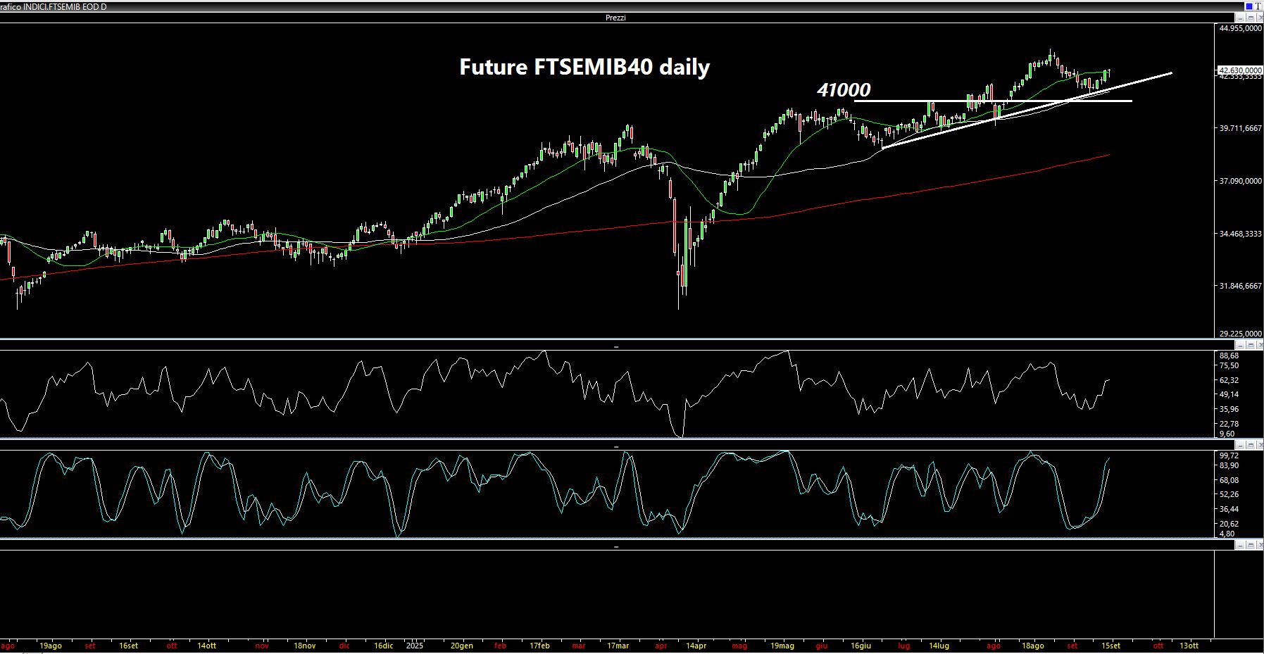 Future FTSEMIB40 daily: il supporto dei 41000 non è nemmeno stato lambito e il mercato si è riportato a spron battuto a 42630. Evidentemente il livello tracciato era sbagliato e forse il mercato italiano sta tenendo una trendline dinamica ascendente che non avevo considerato. Per il momento continuo a mantenere i 41mila come supportone anche se penso più ad uno sviluppo laterale piuttosto che ad un rialzo vero e proprio.