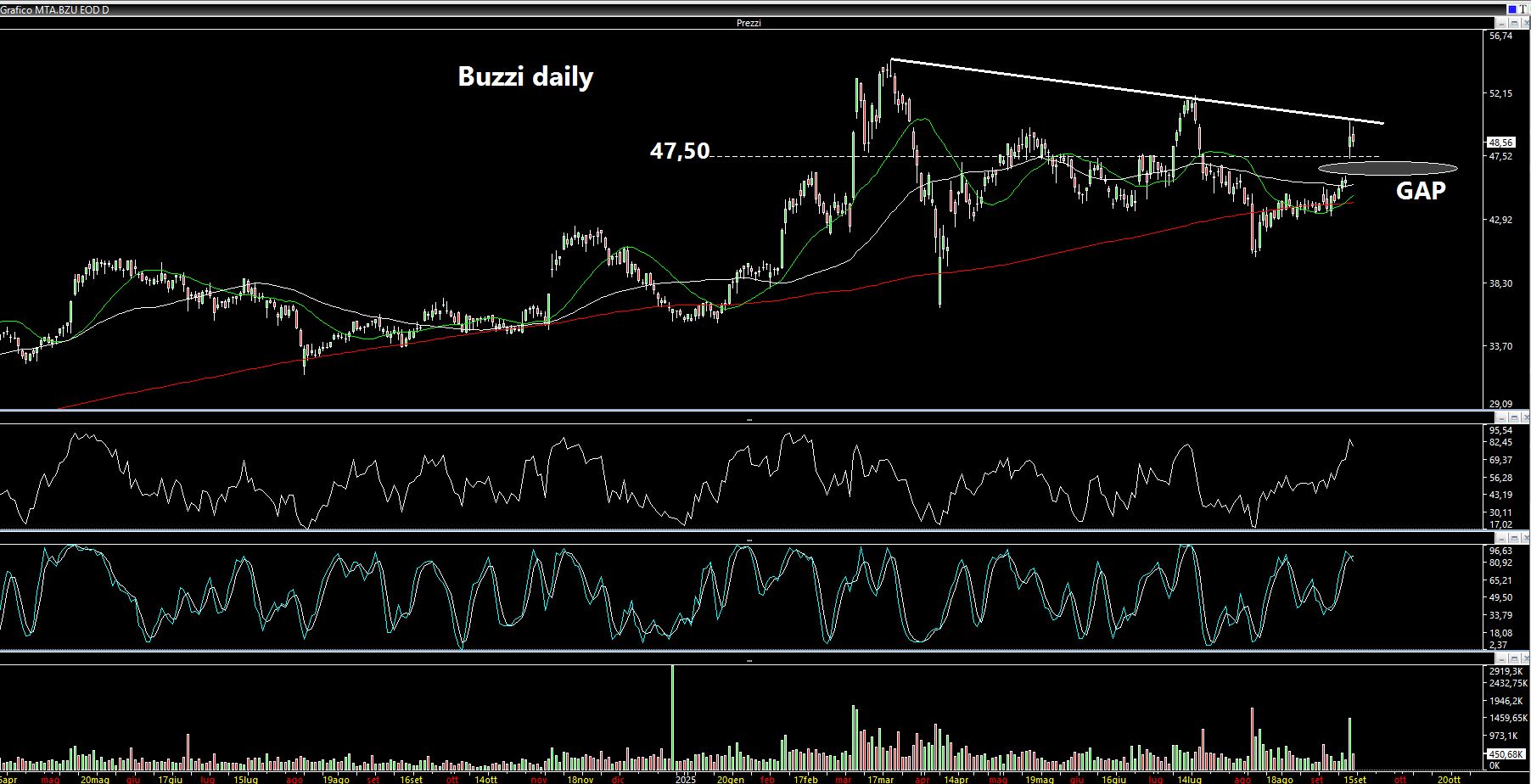 Giovedì è salita in seguito ad una alzata di target a 54 euro da parte di JP Morgan. Per il momento il rally si è "scontrato" sulla trendline dinamica discendente. Da seguire dovesse fare una congestione e mantenere i valori attuali, quindi sopra 47,50 euro rispetto al close a 48,56 di venerdì. Sotto i 47,30 (minimo della seduta di forte gap up) spazio per la chiusura gap verso i 46 euro.