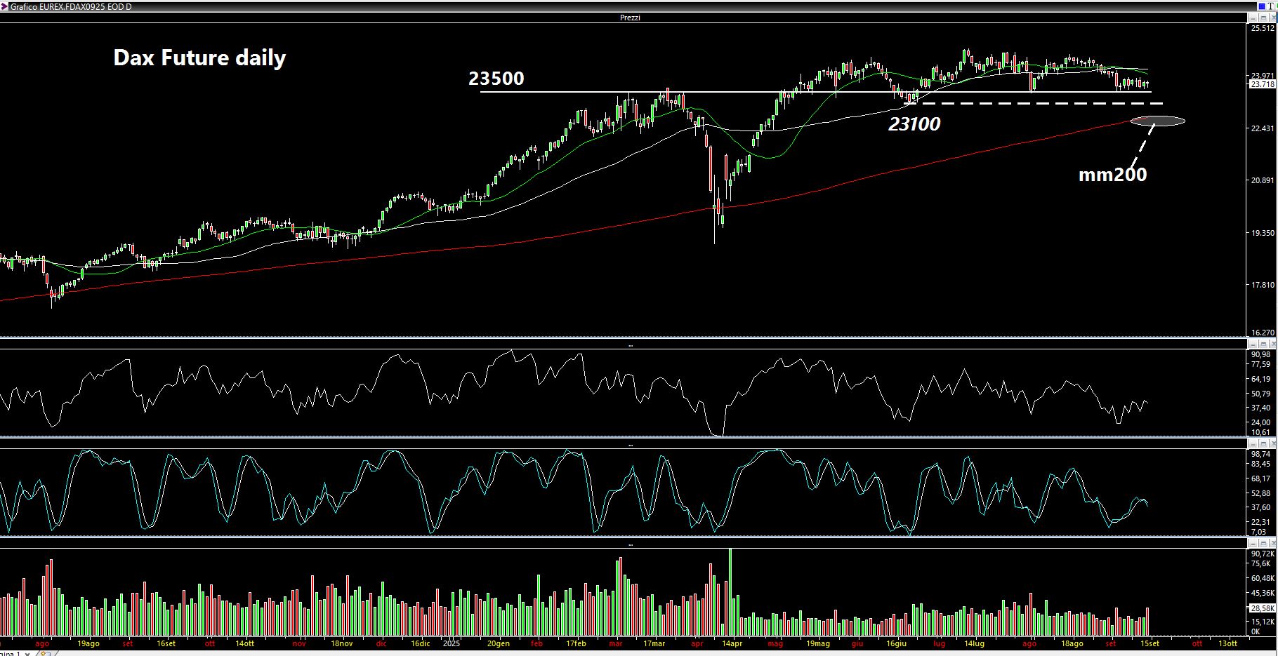 L'unico indice "onesto" è stato il Dax che non è andato da nessuna parte ed ha continuato a "sentire" l'area dei 23500 delinata sabato scorso. Sotto questo livello troviamo i 23100 e poi ancora la mm200.
