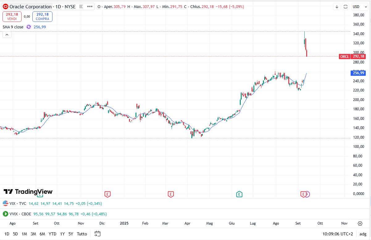 Ho fatto cenno al rialzo di Oracle nella seduta di mercoledì. A titolo informativo: una società csalita del 40% circa in una sola seduta e che al close di ieri capitalizza 800 miliardi di dollari. Credo che tutta la Borsa Italiana capitalizzi, ad oggi, circa un miliardo di euro. Se l'azione dovese tornare in area 260 usd un pensierino con un cippino in stop a 200 ci può stare. Valuterò...