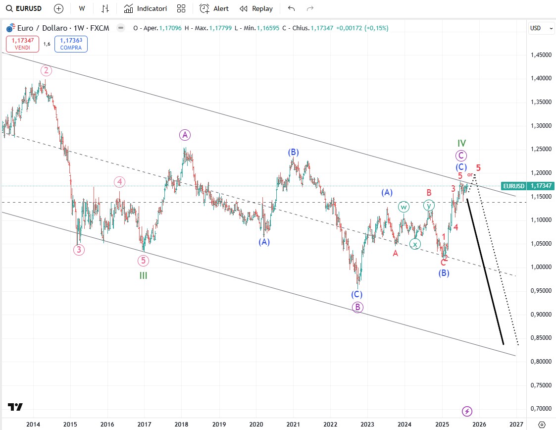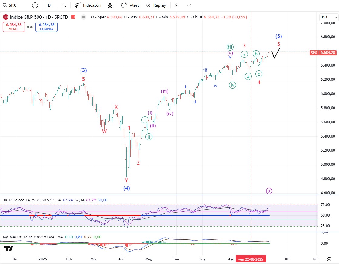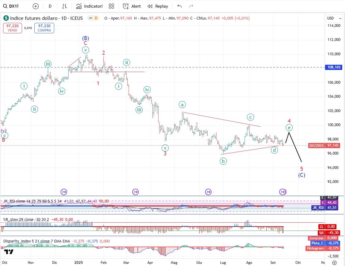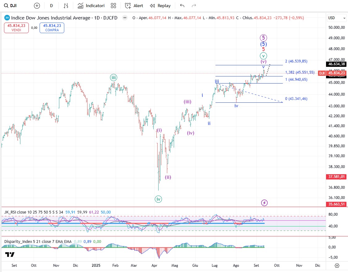 Venerdì della settimana scorsa, il Dow Jones ha raggiunto un massimo intraday a 45.770,20. Questo massimo è stato rotto con decisione giovedì di questa settimana con un massimo a 46137,2 punti e una chiusura vicino al massimo a 46108,01 per poi stornare nella seduta di questo venerdì, dove l’indice è sceso fino a 45813,94 chiudendo appena sopra a 45.834,23 punti. Anche se personalmente sono convinto che manchi ancora un’ultima strappata al rialzo, con il massimo di giovedì diventa possibile etichettare cinque onde a partire dal minimo di agosto. Vedremo come prosegue: Se quello di giovedì fosse il massimo definitivo i prezzi dovrebbero scendere rapidamente con un primo obiettivo a rompere il minimo del 2 settembre.