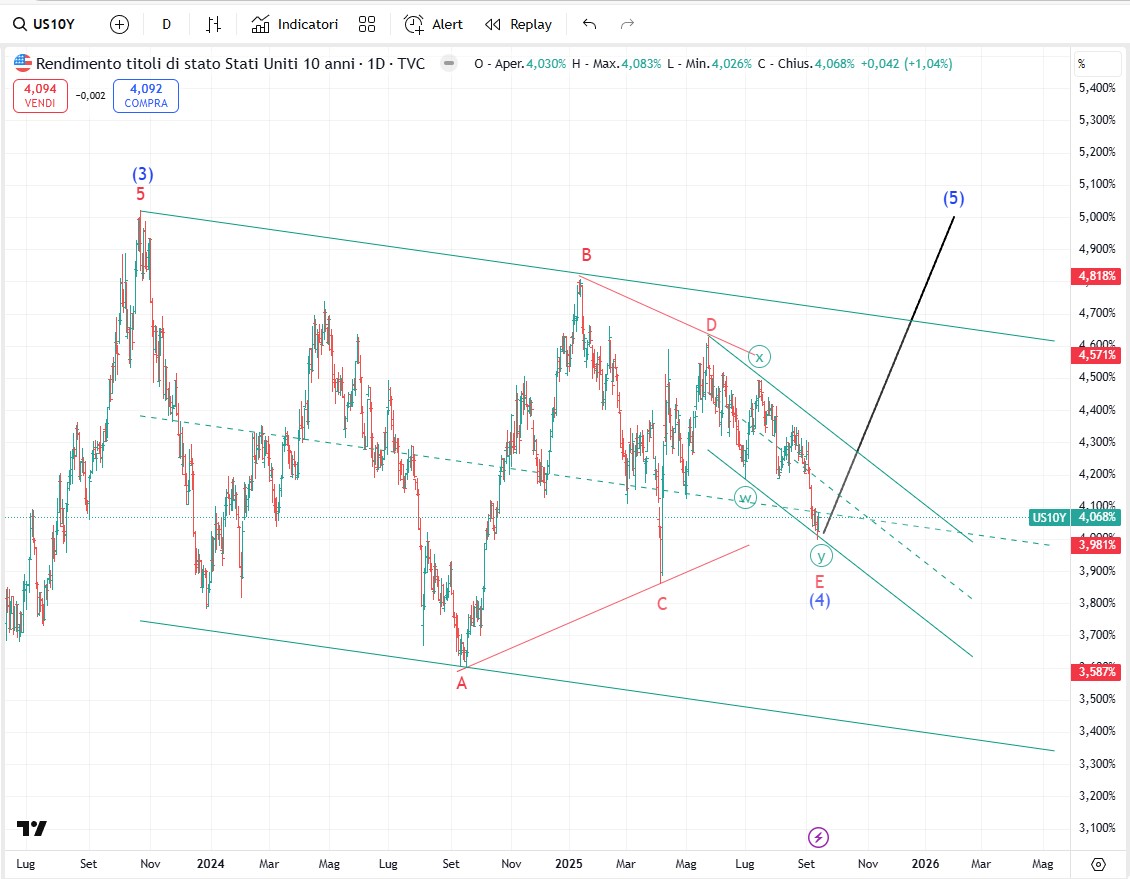 Il calo del rendimento del decennale americano ha raggiunto un minimo intraday al 3,992% nella seduta di giovedì, 11 settembre, e un minimo di chiusura al 4,060%. Il rendimento ha incontrato la linea di tendenza inferiore del canale fuoriuscendo leggermente e poi chiudendo di nuovo al di sopra. Con quest’ultima strappata al ribasso è molto probabile che l’onda (4) sia terminata. Come sempre servono conferme ma una volta iniziata l‘onda (5), i rendimenti aumenteranno significativamente. L'onda (5) sarà un pattern a cinque onde che porterà il rendimento del Titolo del Tesoro a 10 anni sopra al 5,021%, che è il massimo dell'onda (3). Il punto di invalidazione del nostro modello rimane il minimo di onda C che non deve essere violato.